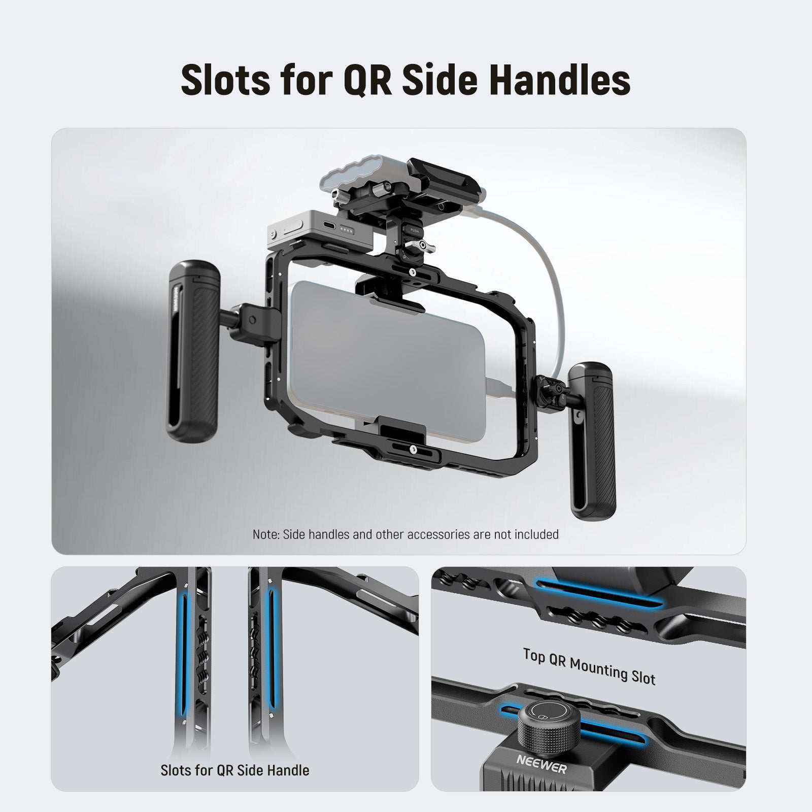 - Slots for QR Side Handles- Four sides of this cage feature dedicated slots for NEEWER PA045B/PA045S/PA045E Clamp On Quick Release Side Handle and other accessories with the same mounting system, including PA065 Quick Release SSD Holder. Note: Side handles and other accessories are not included