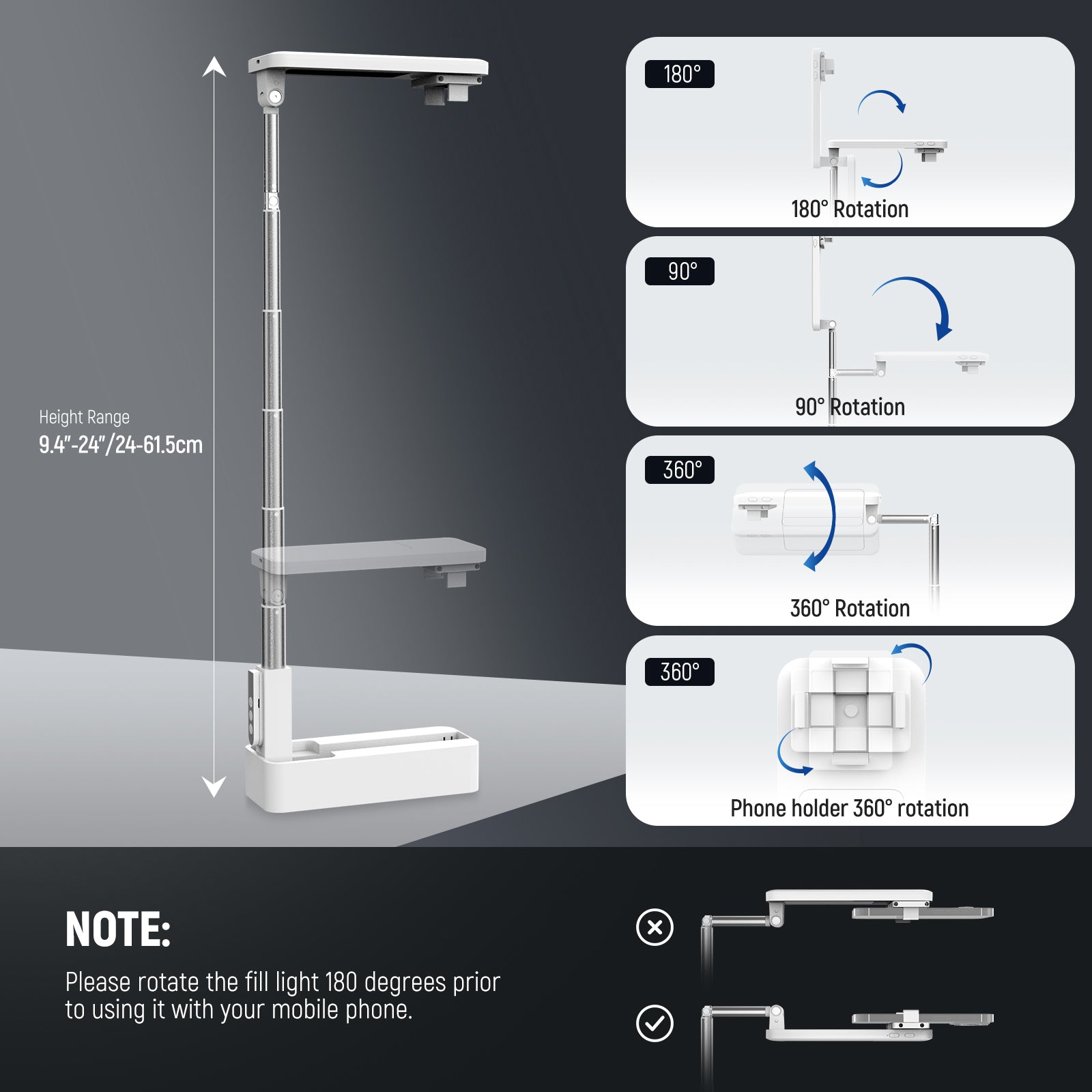 • Light Head: 360° Rotation, 180° Tilt
