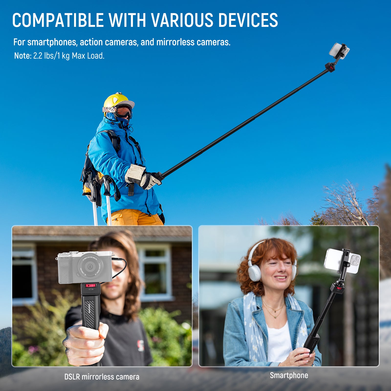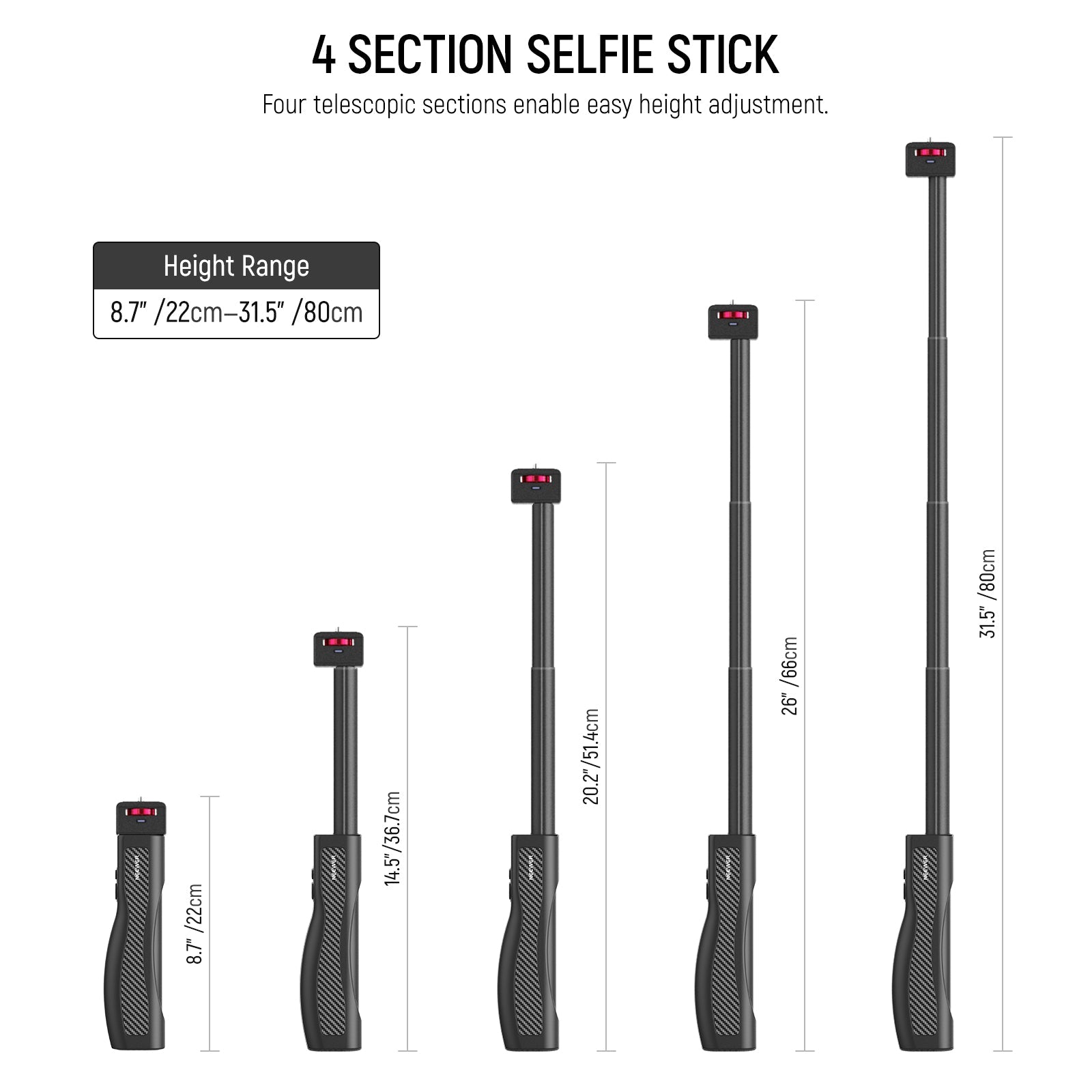 - Telescopic & Adjustable- The selfie stick offers five adjustable lengths from 8.7" (22cm), 14.5" (36.7cm), 20.2" (51.4cm), 26" (66cm) to 31.5" (80cm), providing flexibility for capturing angles and distances when photo shooting and video recording. Max Load 2.2lb / 1kg
