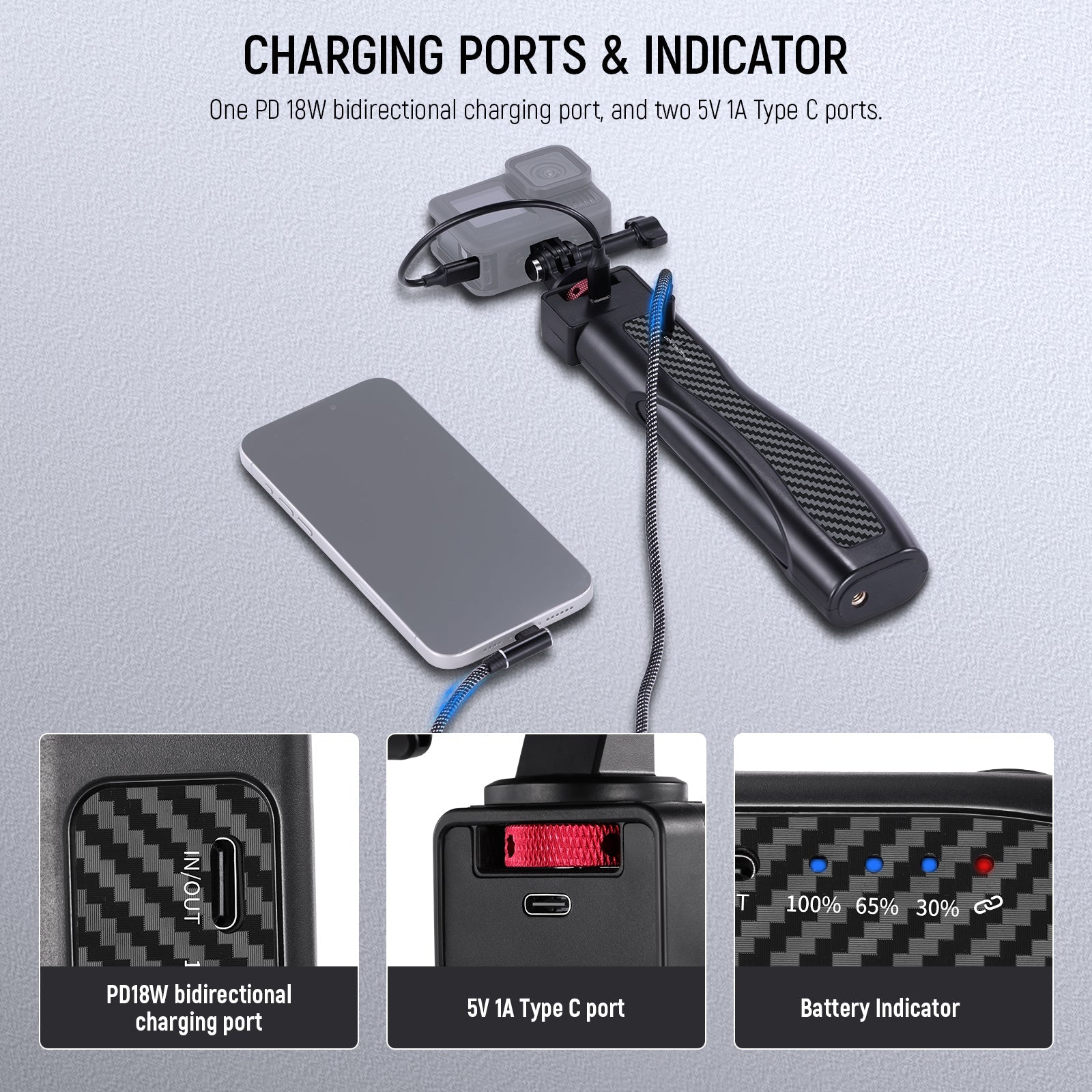 - 3500mAh Built in Battery & PD 18W Bidirectional Charging- The selfie stick features a built in with a 3.7V/3500mAh lithium battery, two 5V 1A Type C ports on the top, and one on the handle for PD18W bidirectional charging, enabling you to charge your device without a power source. Three battery indicators keep you informed of the charging progress