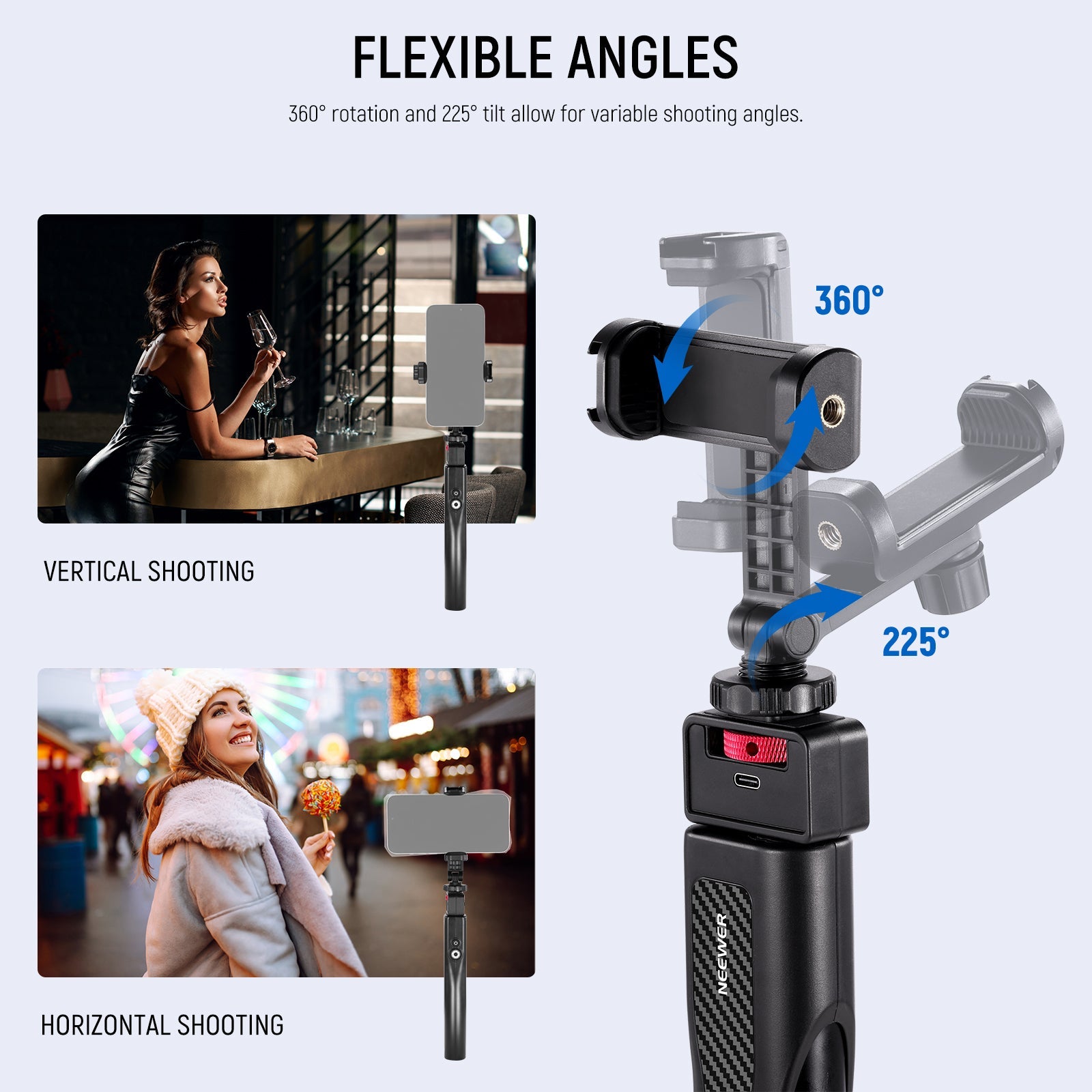 - Extendable Rechargeable Selfie Stick- The selfie stick stand offers 5 adjustable lengths and built in charging for shots while keeping devices powered. A rechargeable lithium battery & dual USB Type C ports for phone and action camera charging (phone holder, adapter, charging cable included). Weighing just 9.7oz (275g), it reduces hand fatigue during extended use compatible with iPhone for vlogging, live streaming, video recording, filming as content creator essential and influencer must have