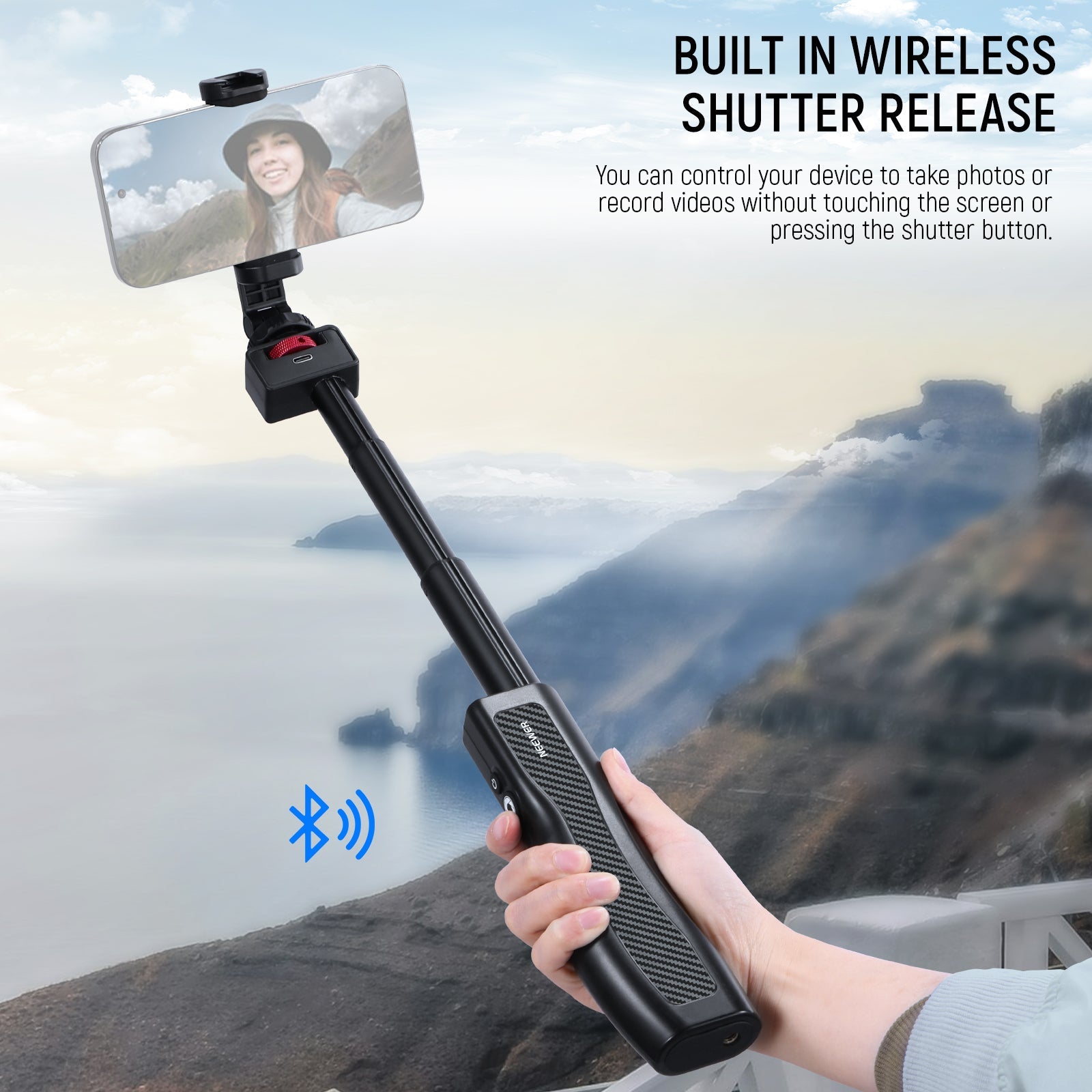 - Built in Wireless Shutter Release- Built in with the Bluetooth control module (smartphones only) , you can control the device to take photos or record videos without having to touch the device screen or press the shutter button on your device. The indicator light shows the connection status at a glance