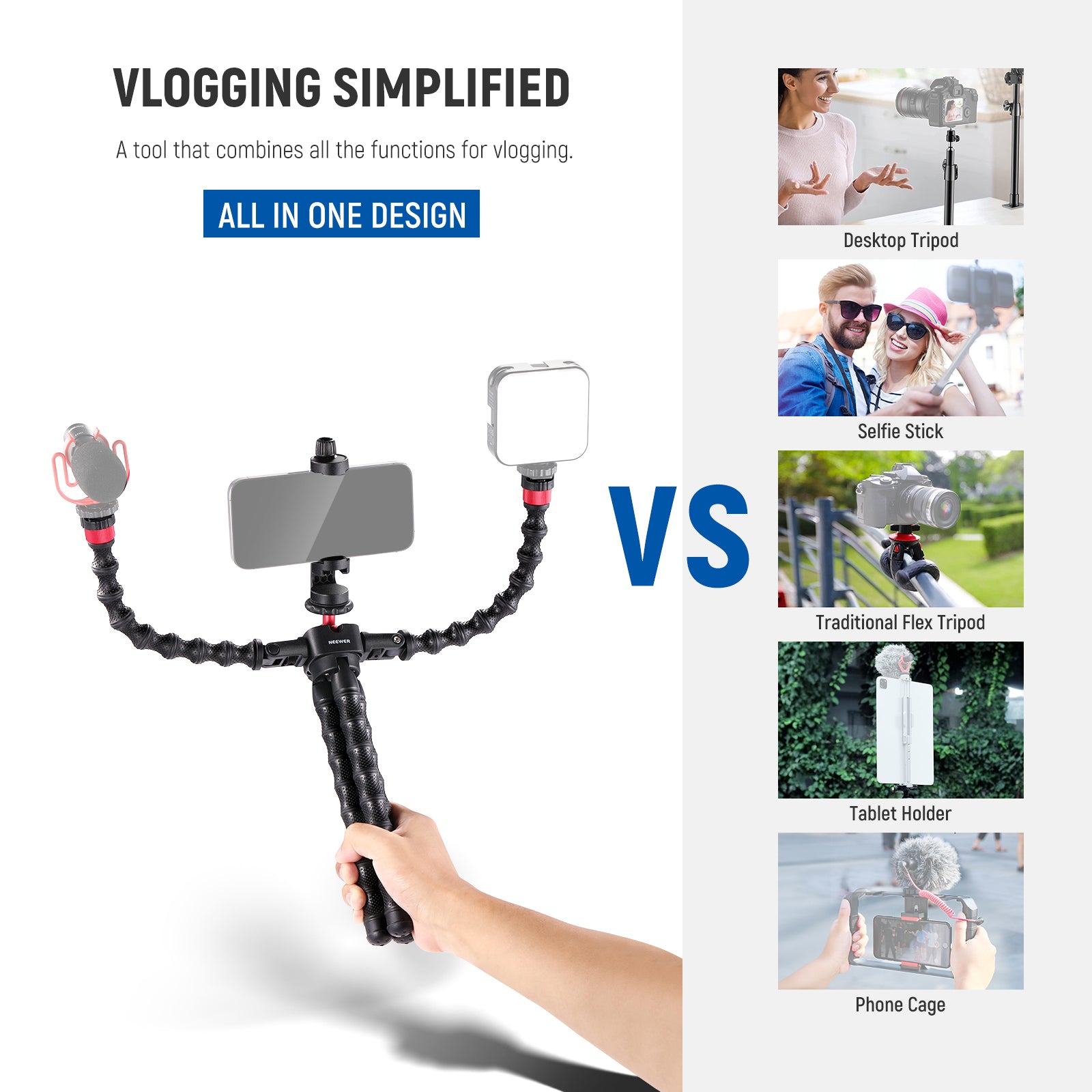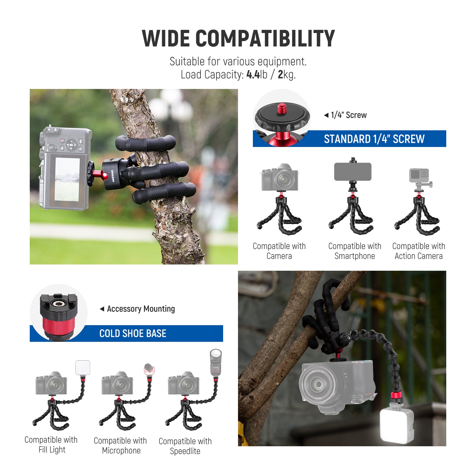 - Flexible Octopus Vlog Tripod- The T91 Flexible Tripod with soft and bendable legs lets you freely adjust the height and angles or warp it around tree branches, lamp posts, or railings. The ball head with a 1/4" screw can support a mirrorless and vlog camera of up to 4.4lb (2kg) and provide 360° rotation and 90° tilts. It also doubles as a handgrip or selfie stick for outdoor shooting