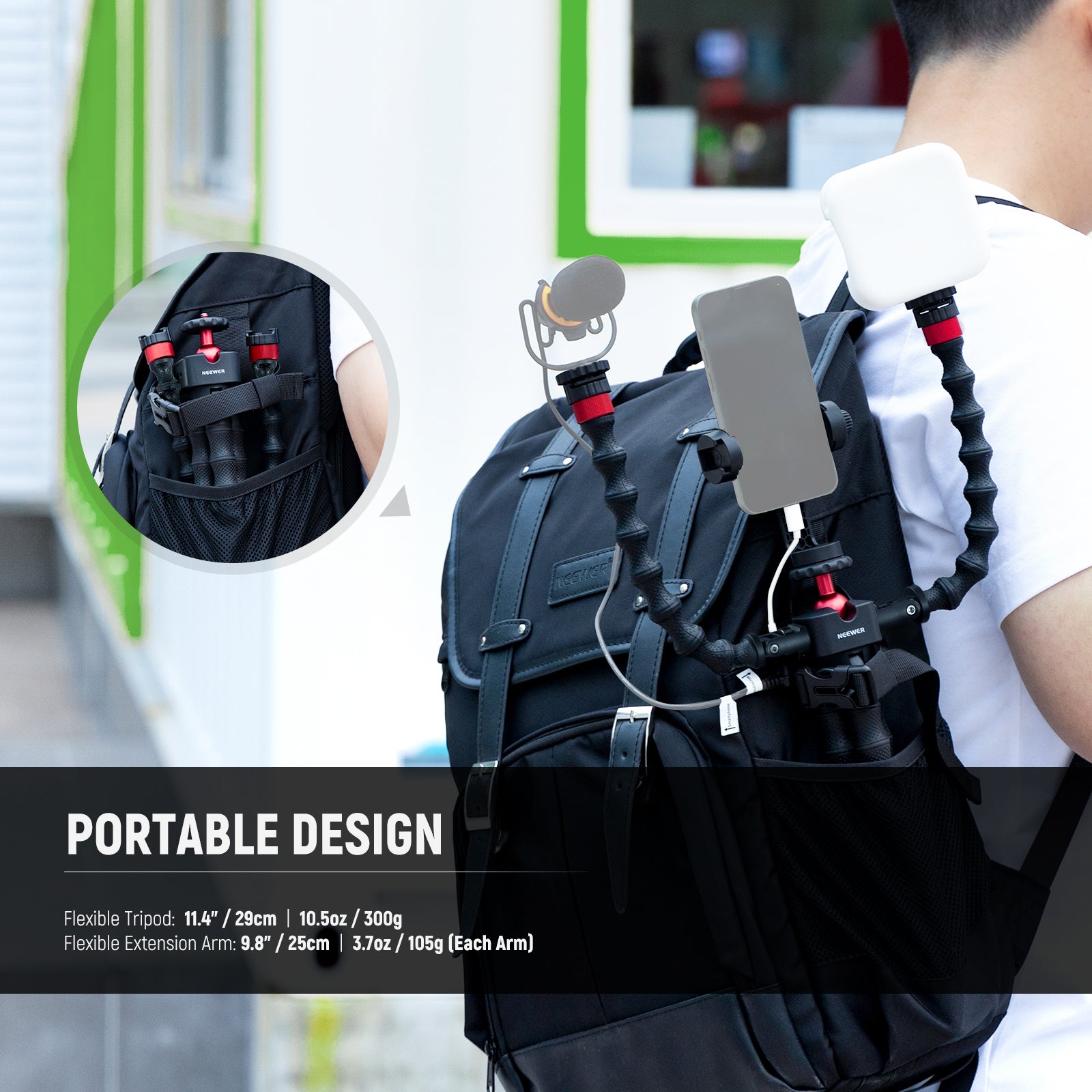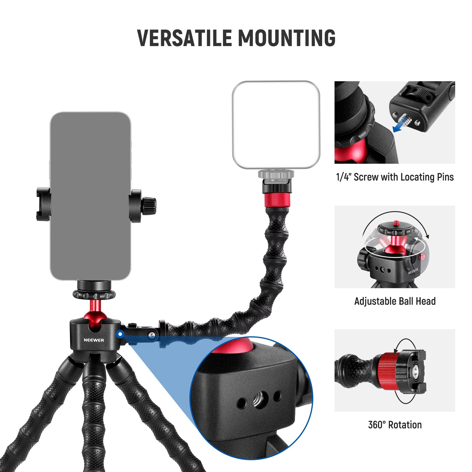 - Two Detachable Extension Arms- Two bendable extension magic arms firmly attach to the tripod via 1/4" screws with locating pins, and have cold shoes on top for mounting accessories such as LED fill lights and mini microphones that help improve the quality of live streaming, selfies, and vlogging