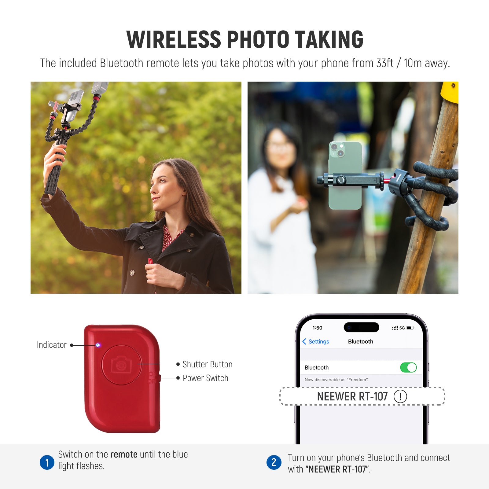 - Handy Remote Shutter Release- Pair the remote shutter release with your iOS or Android mobile devices via the Bluetooth connection, then you can take selfies, capture photos, and record videos with a tap on the button from up to 33ft (10m) away