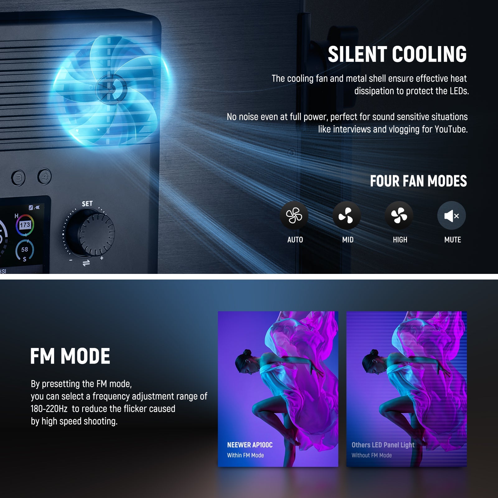 - Silent Cooling & No Flicker- With dual cooling fans and an all metal panel, AP100C key/fill light offers Smart, Medium, High, Silent modes for efficient heat dissipation, quiet recording even at full fan speed, ideal lighting for sensitive audio environments like podcast, broadcasting, streamer live streaming, for YouTube video recording as content creator essential and influencer must have. The smart FM mode adjusts the light’s output frequency to eliminate flicker during high speed captures