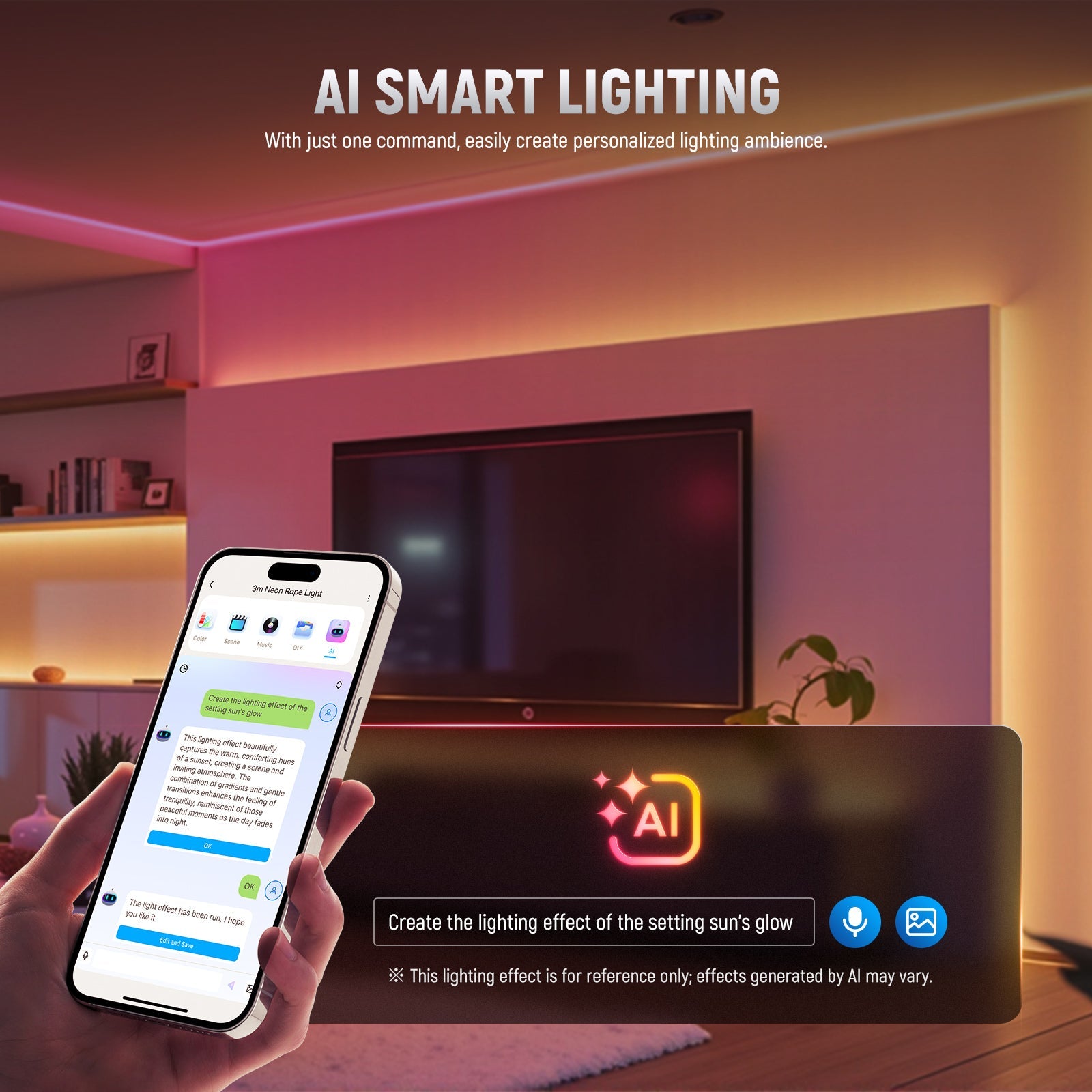 • AI Design & Creative DIY Mode- Powered by the NEEWER Smart AI Lighting Engine, the waterproof LED neon rope light can generate lighting effects based on your voice, text, or image commands. The Creative DIY Mode lets you unleash your imagination to customize endless personalized lighting effects. Ideal colored strip decorations for home, teen boy bedroom, living room, bathroom, kids bed room bunk, gamer gaming, music studio, dorm ceiling, bar, festival, party, and outdoor cool decor stuff