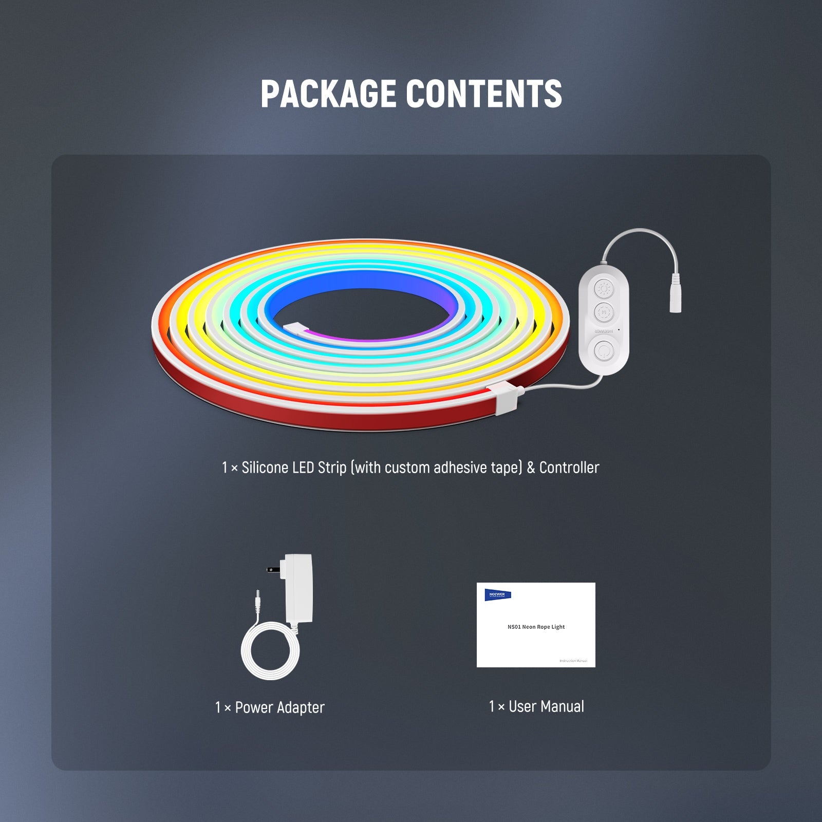 • Bright & Flexible Silicone Strip Light- The NS01 neon LED strip is made of pure waterproof silicone, soft, flexible, and easy to bend, allowing easy installation in bedrooms, corners, eaves, along walls, or inside wardrobes. The front emitting design, with 252 LEDs (84 LEDs/m) embedded in the high transmission silicone strip, delivers bright, natural, and diffused colorful light for a dreamy & inviting home ambiance