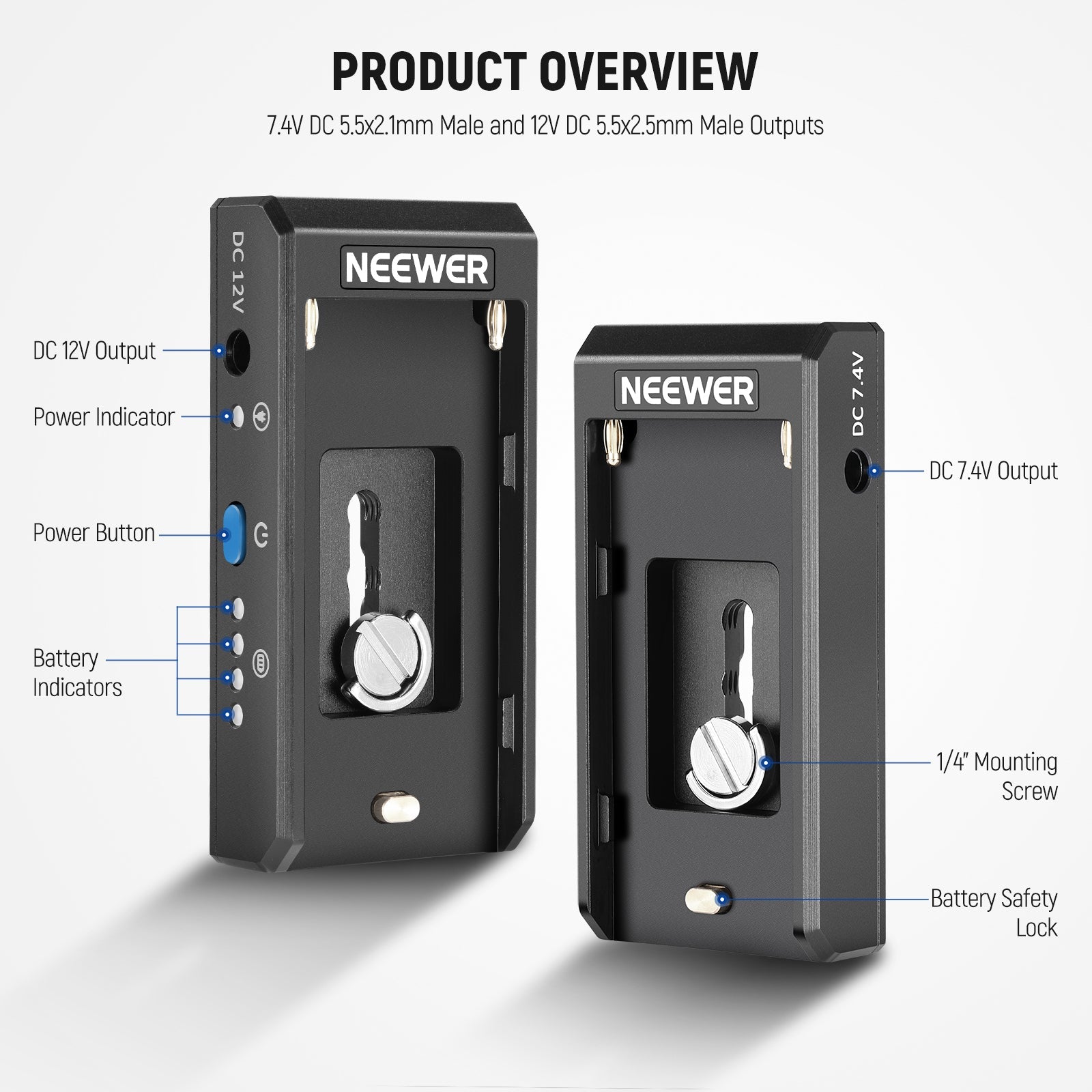 - Dual Output Ports- 7.4V male DC output port (5.5x2.1mm) and 12V male DC output port (5.5x2.5mm) split battery power to charge a digital camera and a field monitor simultaneously. Note: DC cables are sold separately
