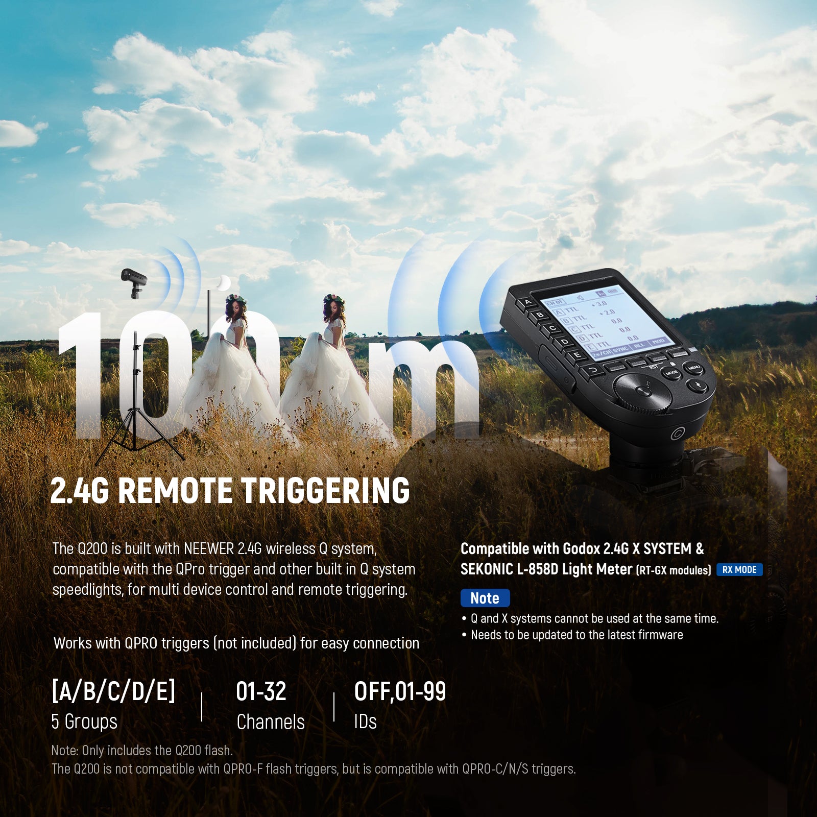 - Powerful 2.4G Wireless Trigger System- Built in NEEWER 2.4G Q system enables triggering up to 328ft/100m. Works with QPRO-C/N/S triggers (not QPRO-F) and Q system flashes like Z2/Z880/NW760 (not included). 5 groups, 32 channels, and 01-99 IDs for multi light control. Mask function separates subject and background for post processing. Compatible with Sekonic L-858D (RT-GX) Godox 2.4G X system (RX COMPAT menu) or as a slave with Xpro/X3/X2. Note: Q and X systems cannot run simultaneously; firmware update required