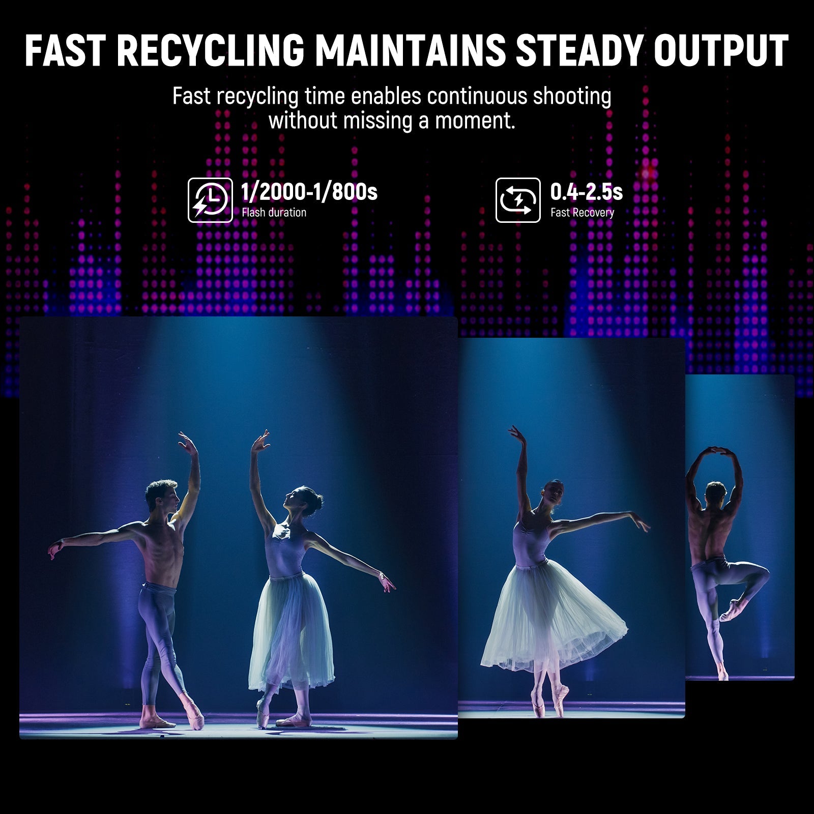 - Excellent 150W Modeling Lamp- Compact yet capable, the 150W modeling lamp has 9 brightness levels (L1–L9) and 7.0–10 (1/8–1/1) flash power adjustment to match actual ambient light conditions. 1/2000–1/800s flash duration and 0.4-2.5s recycling time help you capture every precious moment. The flash tube with a stable power output resists high heat, high voltage, deformation, and breakage. Memory function saves settings for use the next time