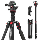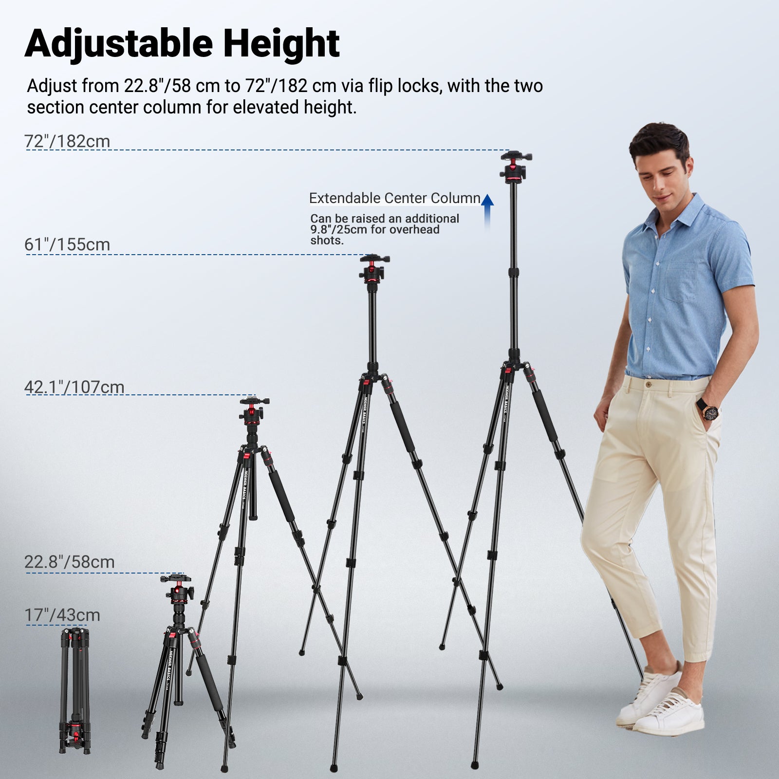 • Quick & Easy Adjustment- The tall phone camera tripod mount adjusts from 22.8" to 52", with the 2 section center column that elevates up to 72", and can be inverted for macro shots, plus 3 leg angle quick adjustments
