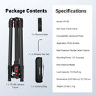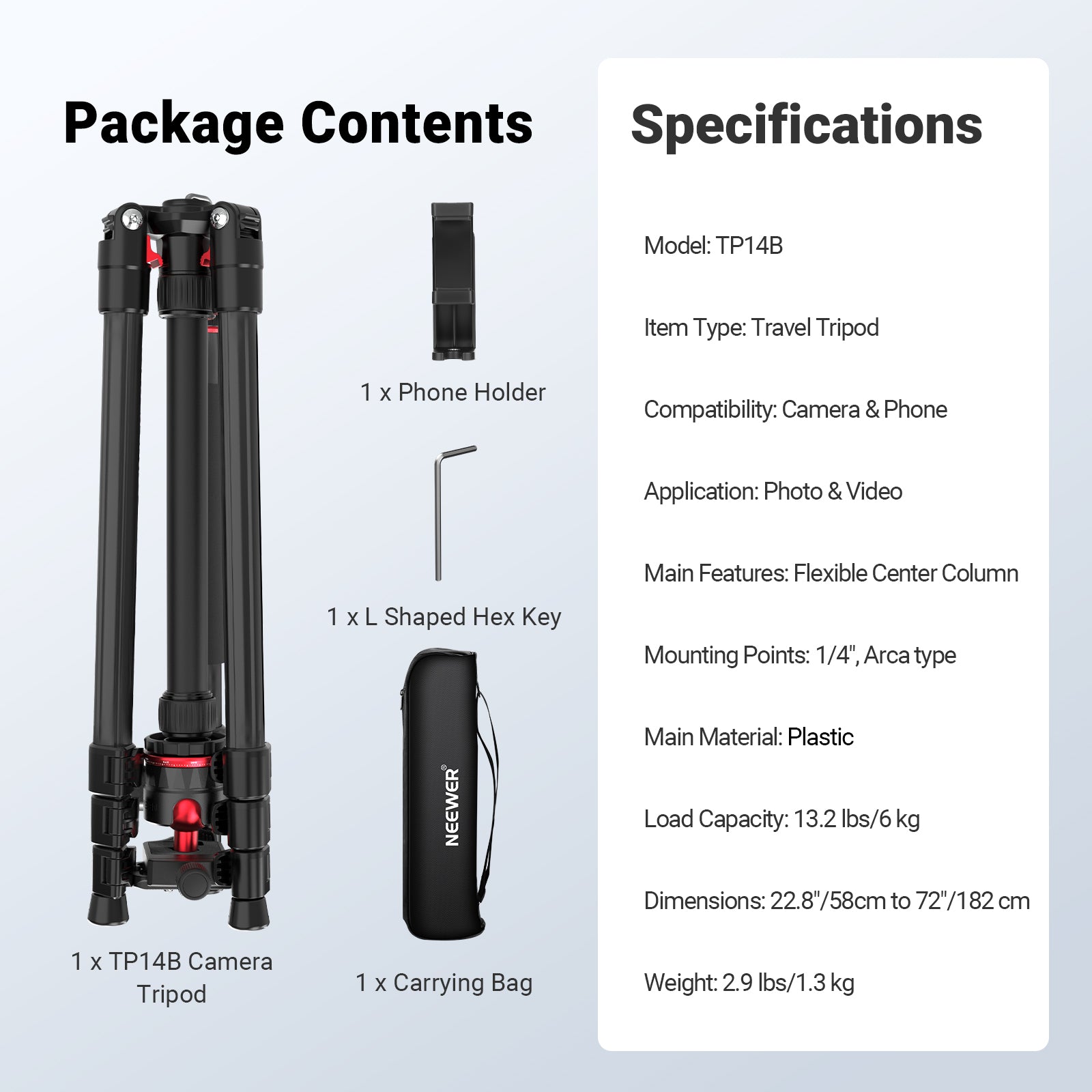• 360° Ball Head- The tripod for phone and camera allows 360° panorama, 90° tilt, and a 360° leveling scale; the 1/4" Arca type quick release plate is compatible with Sony Canon Nikon camera gears and camcorders. Max load 13.2 lbs