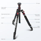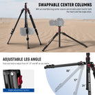 • 2 Axis Flexible Center Column- 1. The unique design of the center column consisting of 2 sections enables the maximum height of the tripod and monopod to be higher; 2. The center axis can be inverted for macro photography, or completely detached for low angle shooting; 3. Combine the center column and the legs as a regular camera tripod, and reverse the legs when stored. Includes a handy hook to hang sandbags (not included) for increased stability