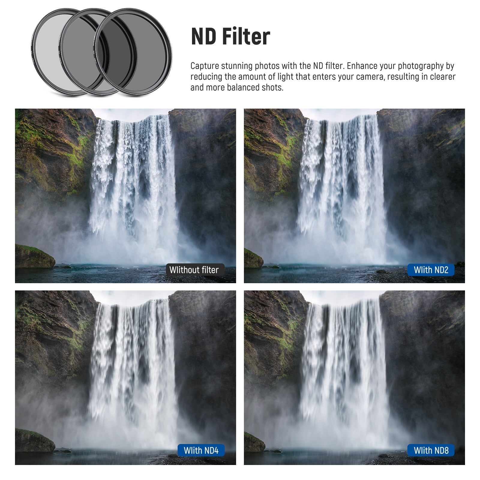 - Balanced Exposure with ND Filters- Neutral density filters reduce the amount of light entering camera sensor by various degrees, ND2 by 1 stop, ND4 by 2 stops, and ND8 by 3 stops, to achieve balanced exposure across images under different light conditions. These ND filters also make long exposure shots possible by slowing shutter speed