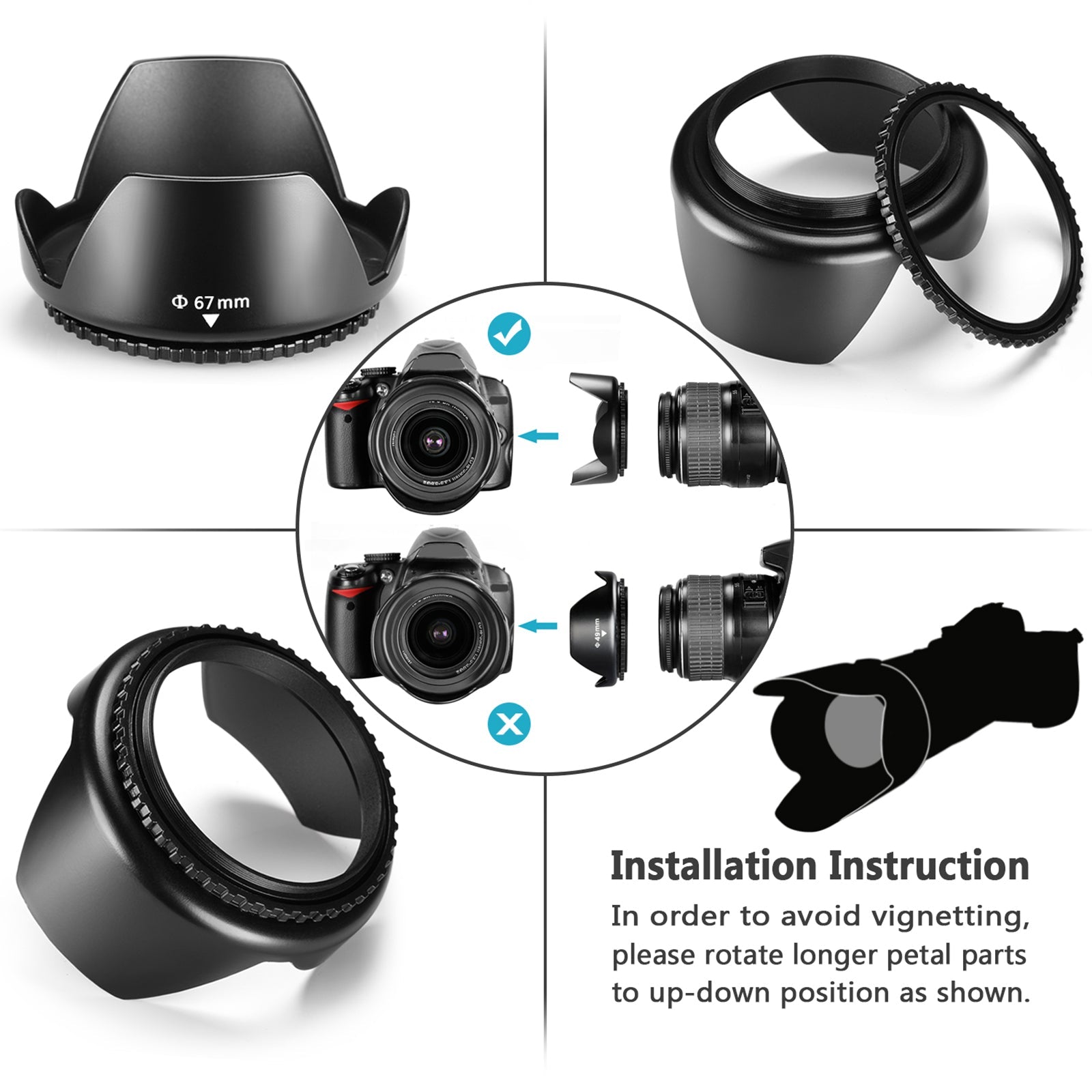 - Two Lens Hood Provided- A tulip shaped lens hood and a collapsible rubber lens hood help block excessive sunlight and reduce glare and flare. The collapsible rubber lens hood can be folded into three shapes, tulip, flower, and pedal, for greater versatility. The tulip lens hood is well suited for wide angle lenses as it won’t cause vignetting