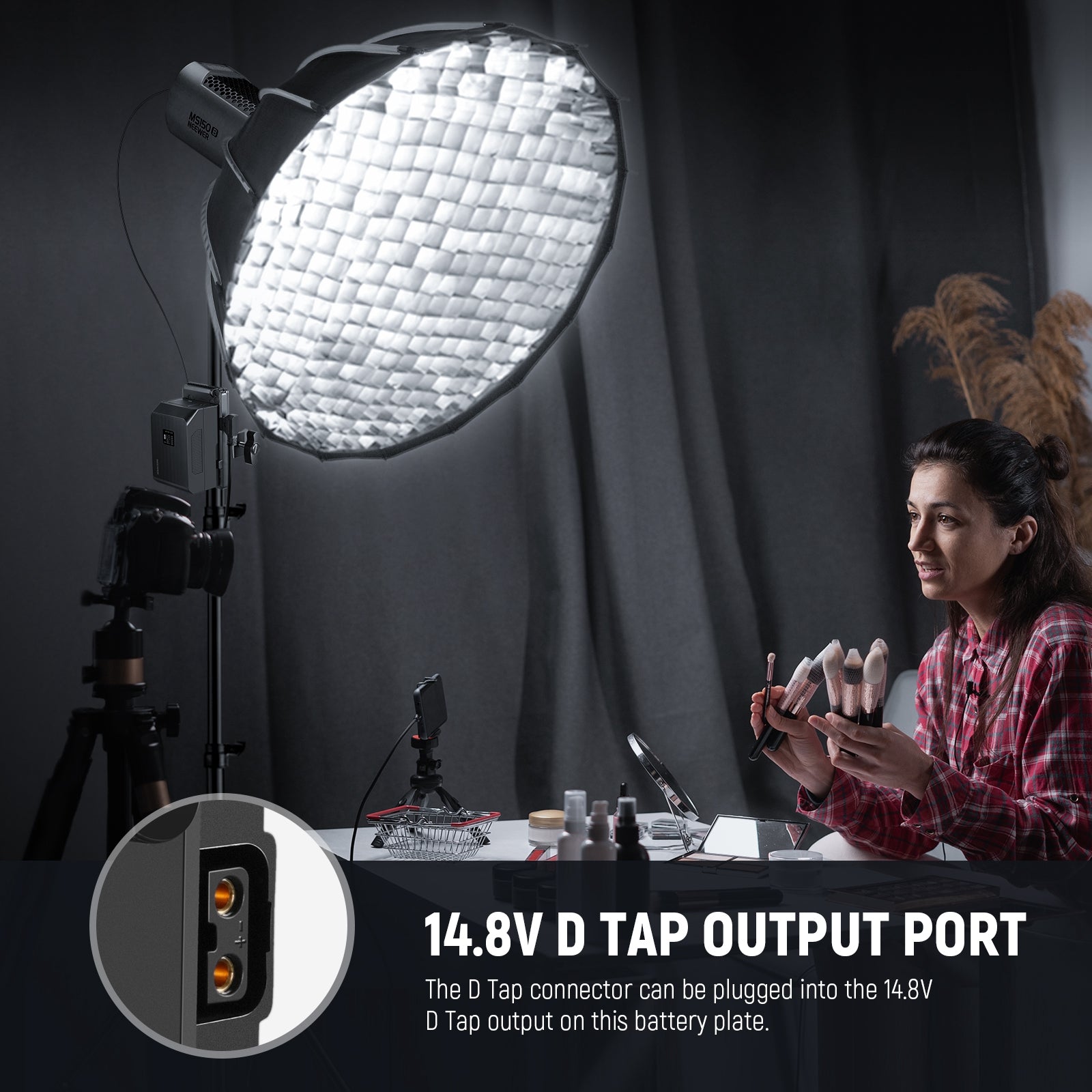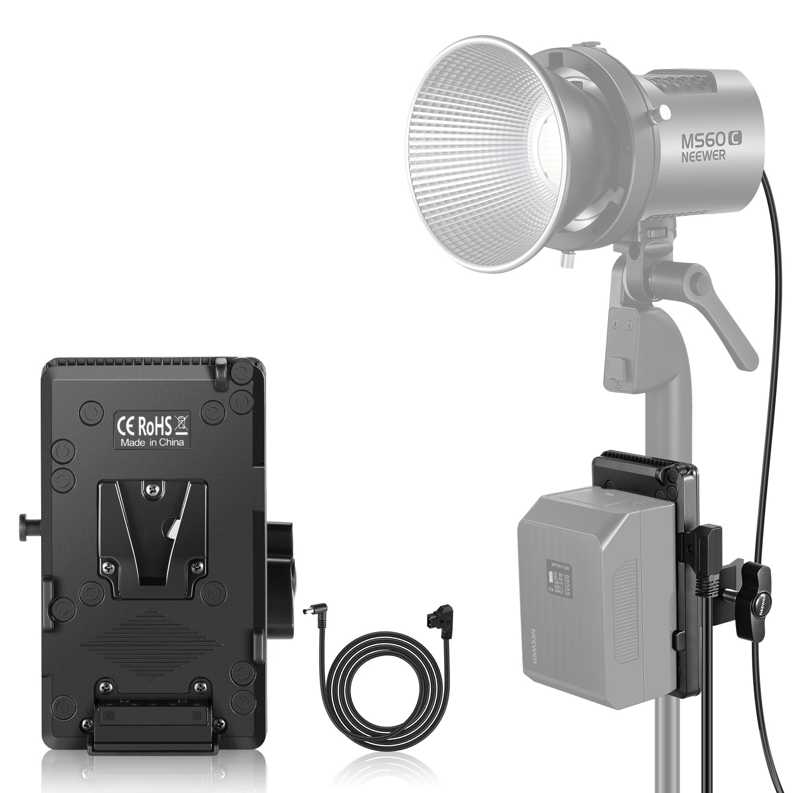 - 14.8V D Tap Output Port- The D Tap connector can be plugged into the 14.8V D Tap output on this battery plate if your V mount battery is not available with a D tap port. Note: Only compatible with NEEWER MS Series COB Lights