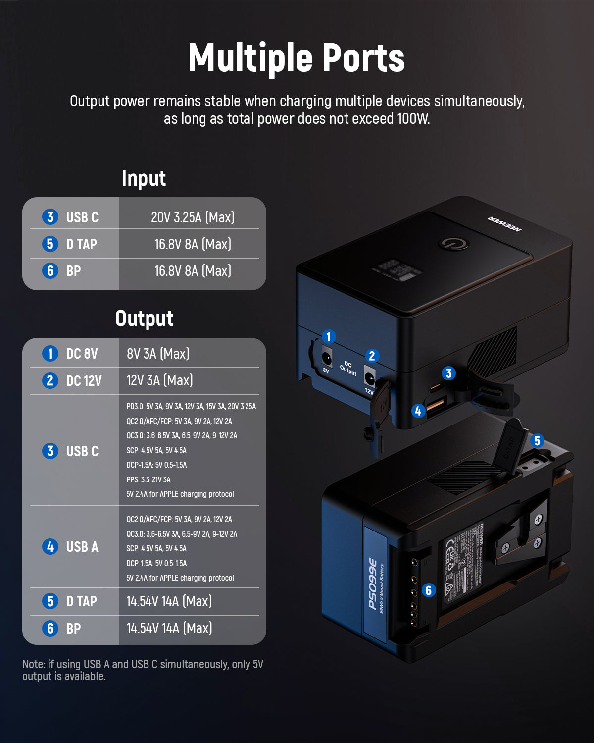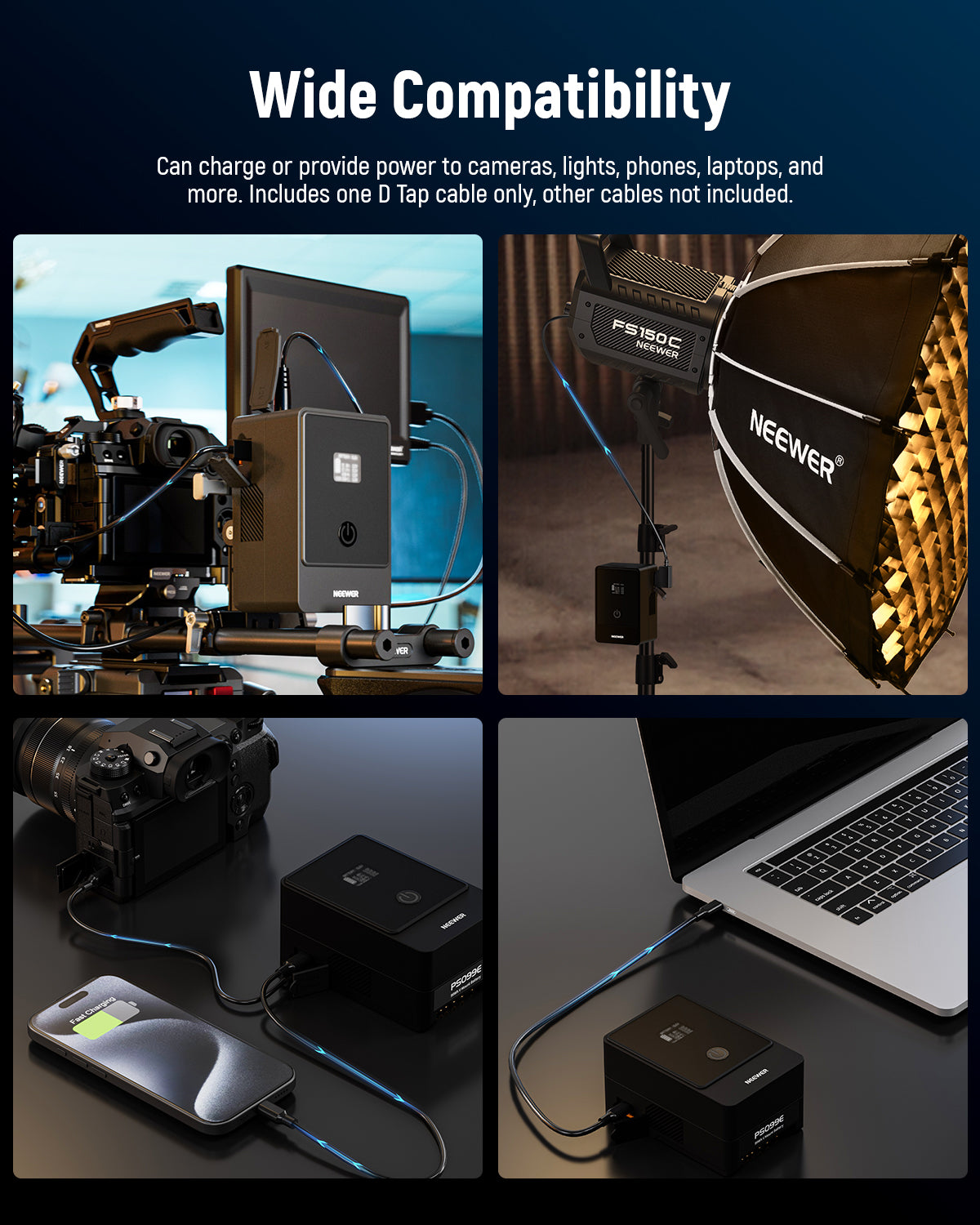 Multiple Ports for Various Gear- With dual USB A and USB C, 5.5x2.1mm DC 8V & 5.5x2.5mm DC 12V ports, BP and D Tap interfaces to simultaneously charge multiple devices like DSLRs compatible with Canon Sony Nikon BMPCC 4K 6K Cinema Cameras, field monitor (compatible with Atomos Ninja V NEEWER F700), LED video lights, V mount battery plates (ST43, PS015 Pro). Dust covers included for protection