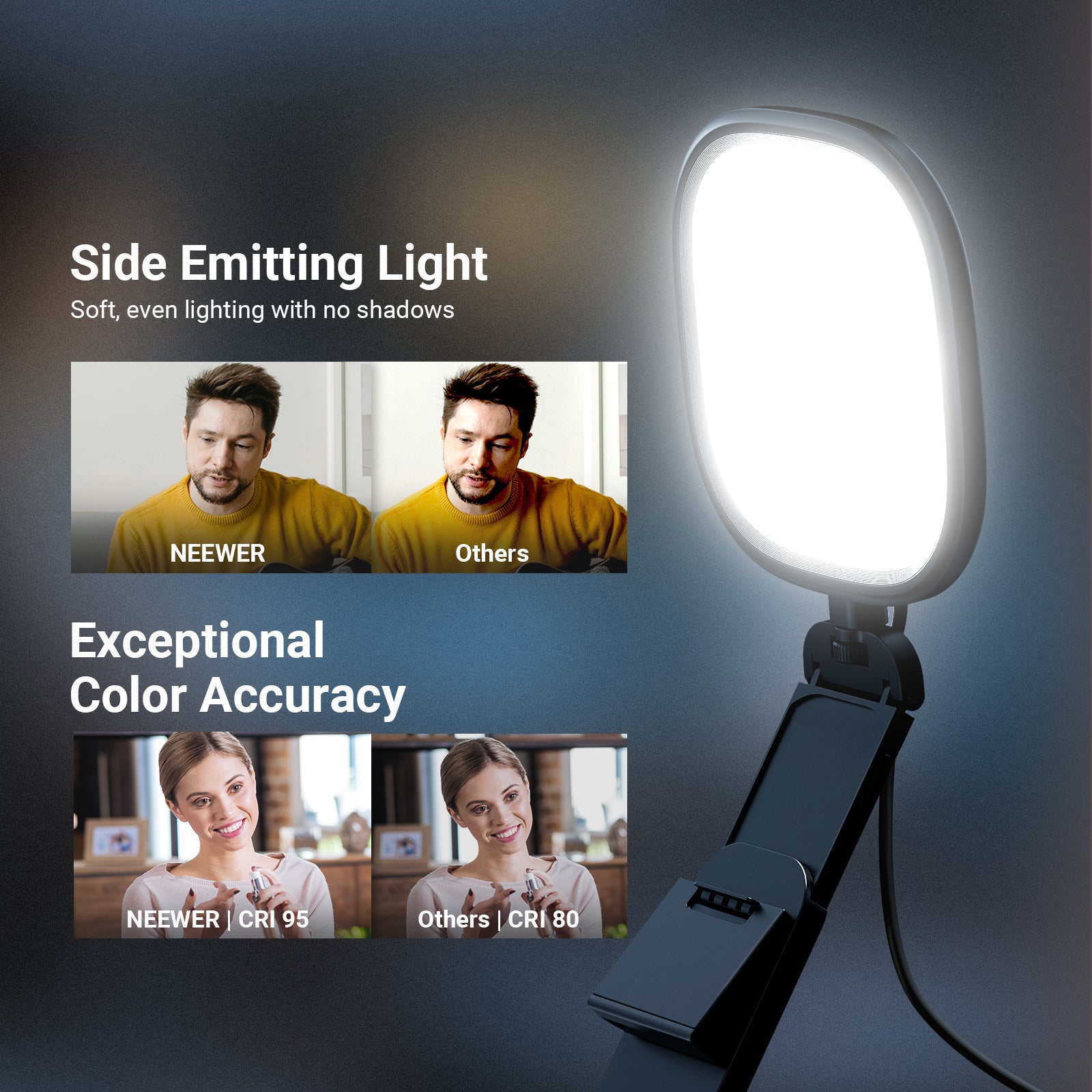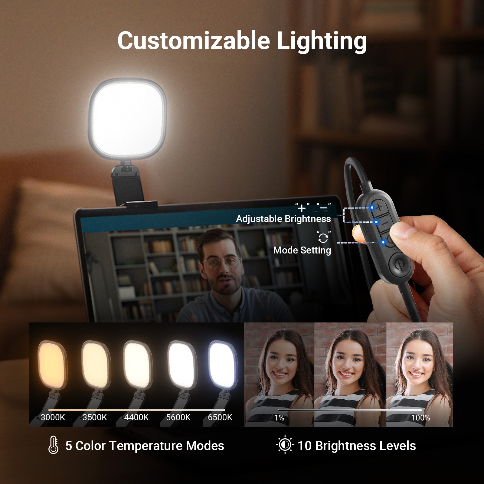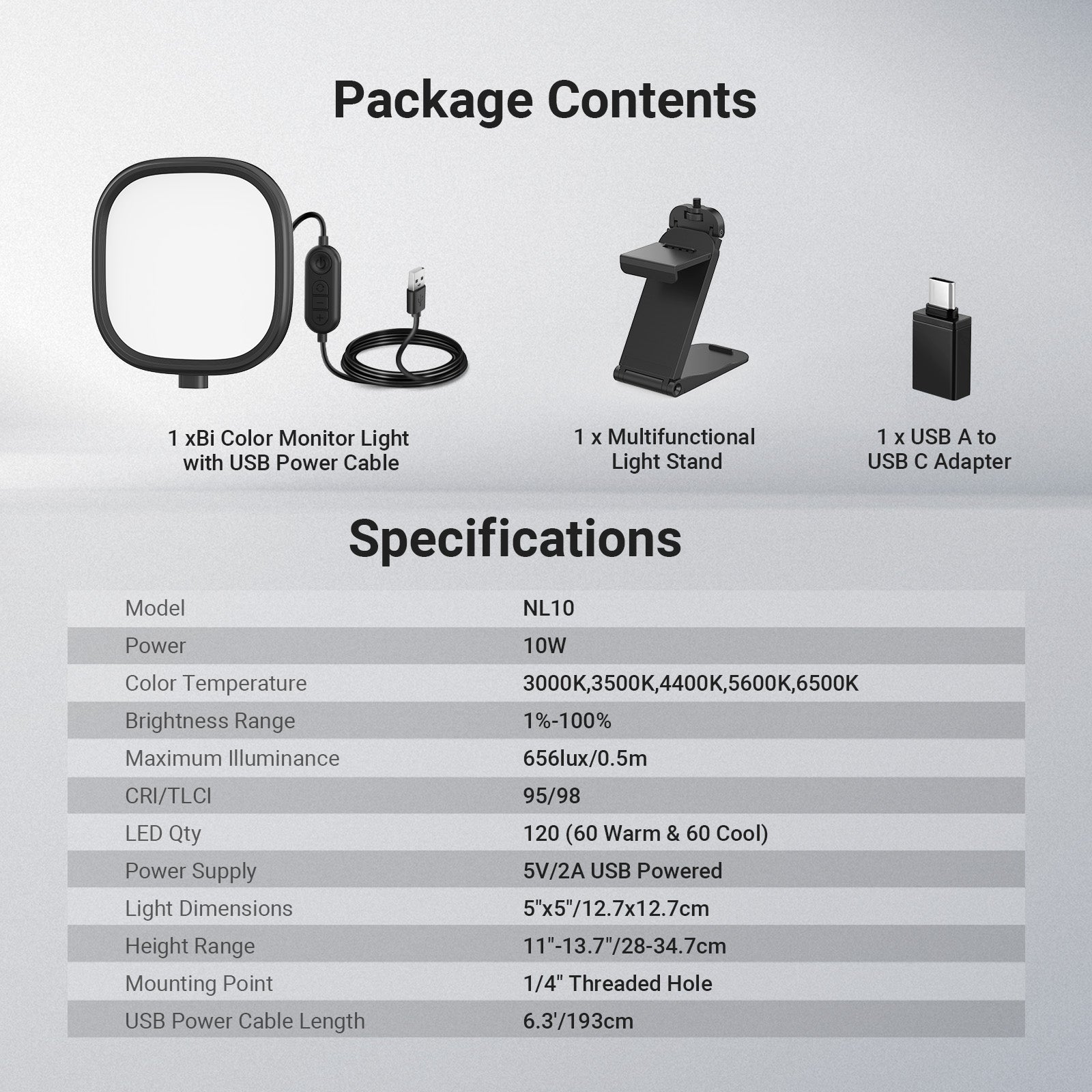- Adjustable Light- NEEWER NL10 monitor light is equipped with120 bi color LEDs for up to 656lux/0.5m, offering 5 CCT modes and 10 brightness levels to flatter all skin tones and suit various desk video lighting needs. The memory function auto recalls your last used color temperature and brightness settings. A USB A to USB C adapter is included
