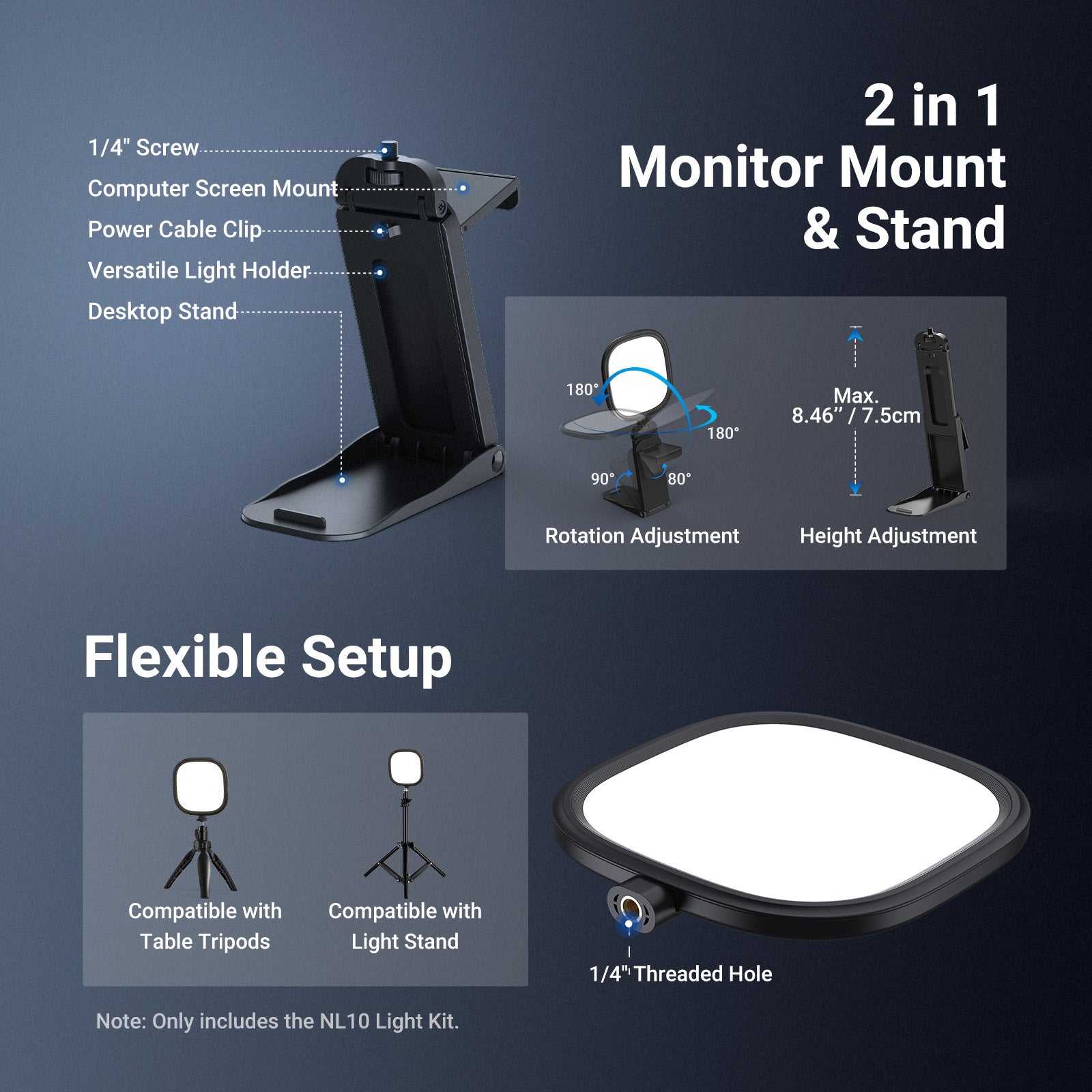 - Multifunctional Light Stand & Adjustable Height/Angle- The detachable stand with a 1/4" screw attaches the webcam light to the top of a monitor, with 4 adjustable height levels. Doubles as a mini desktop stand to hold both the light and a smartphone for phone camera photography/videography as social media content creator essential photo film prop, streamer influencer must have gear. The light head tilts 180° front to back and rotates 360° horizontally from left to right for flexible lighting