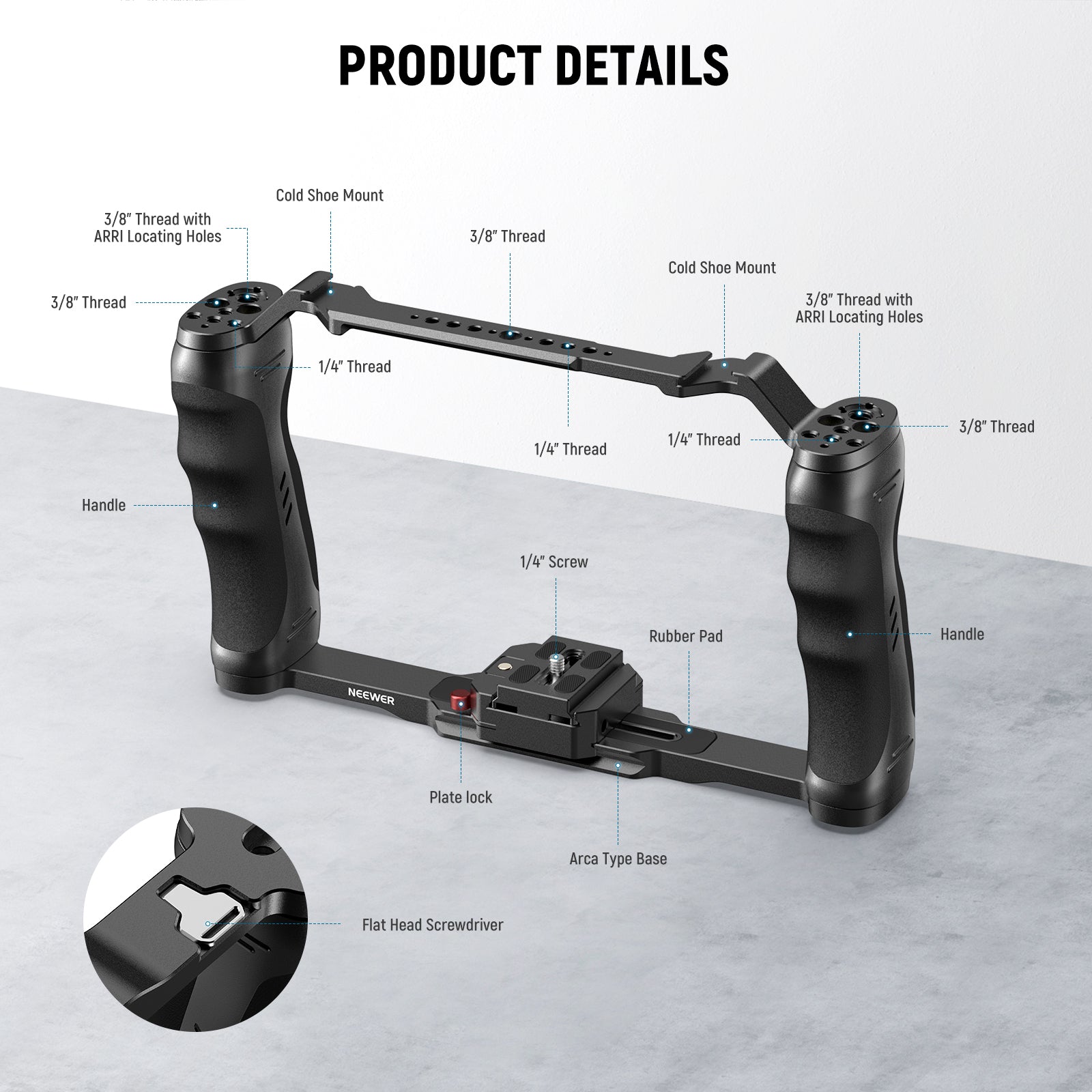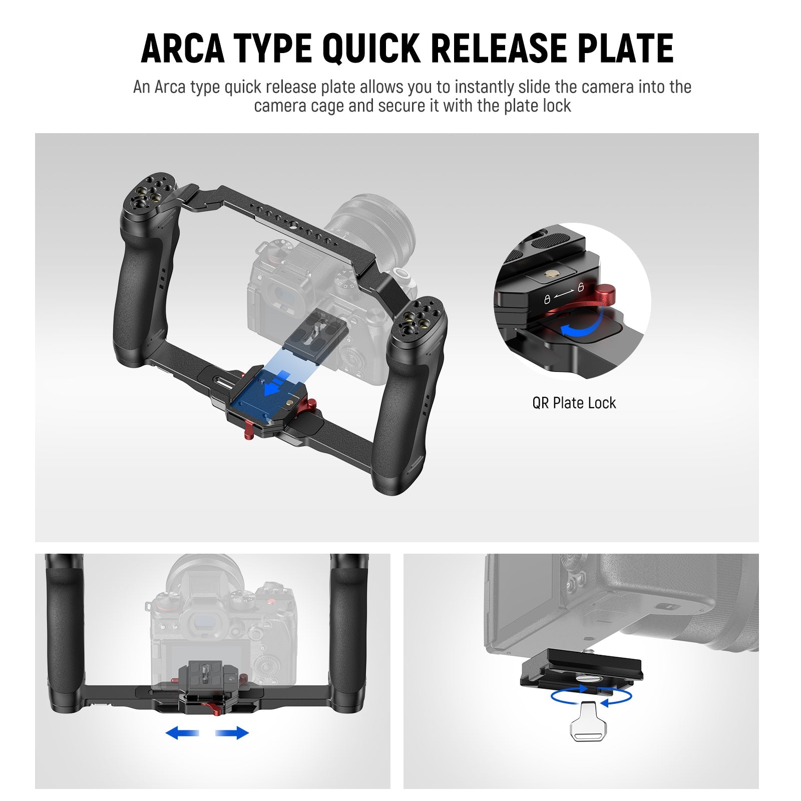 - Arca Type Quick Release Plate- An Arca type quick release plate allows you to instantly slide the camera into the camera cage and secure it with the plate lock. A release button can prevent the mounted camera from dropping for reassuring safety. Or, you can remove the quick release plate and directly mount your camera on the 1/4" countersink slot