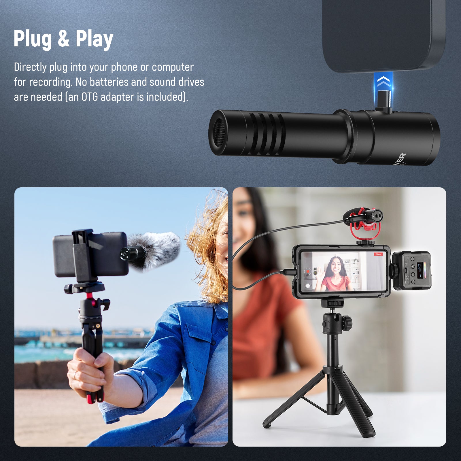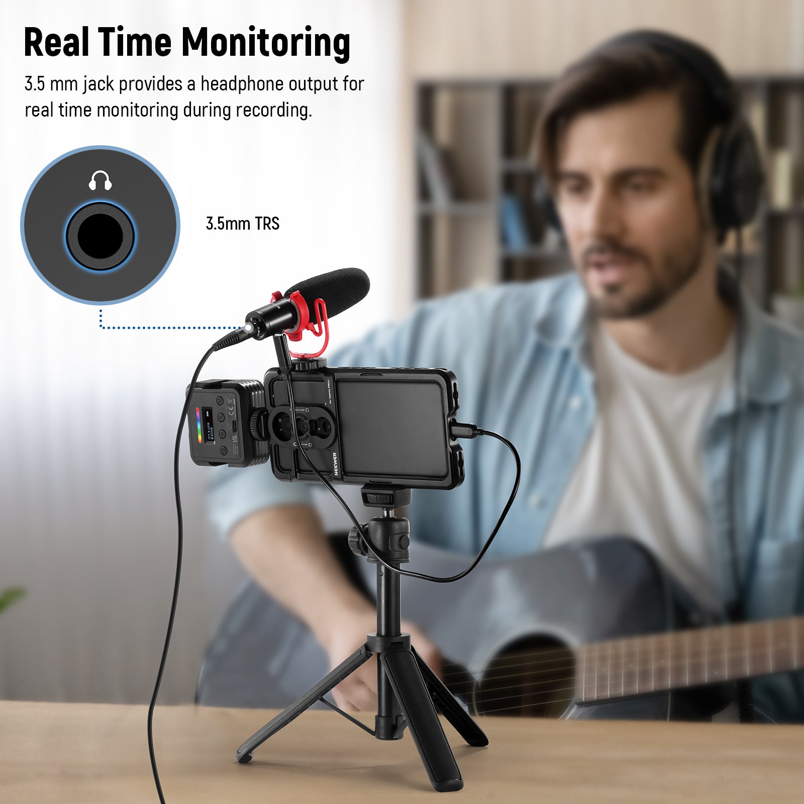 - Plug&Play- Directly connect the microphone to your phone through its integrated Type C connector, The 3.5mm jack provides a headphone output for real time monitoring during recording