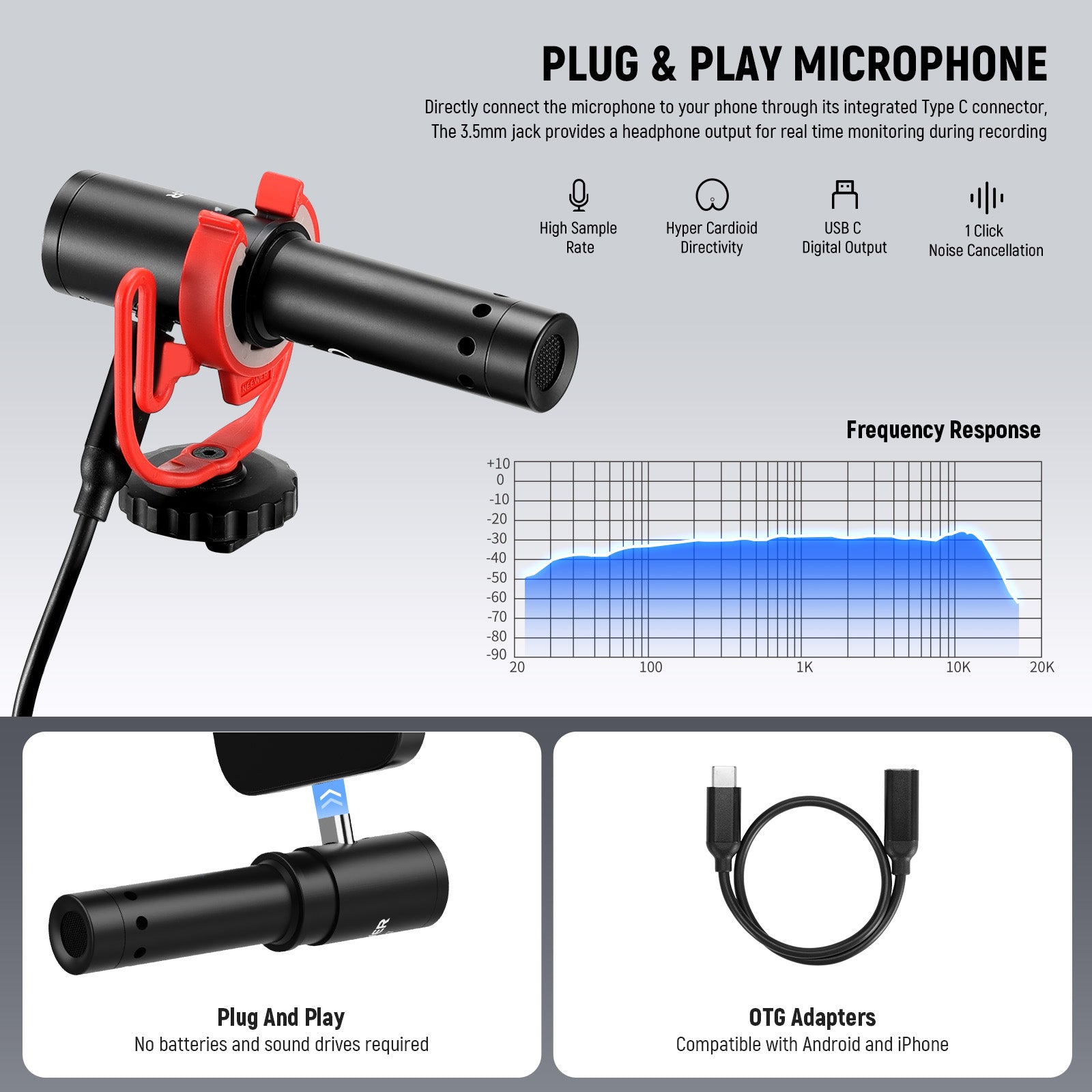 - Microphone USB-C Plug & Play - Le mini microphone cardioïde avec réduction de bruit garantit un son clair. Son connecteur USB-C, associé aux deux adaptateurs OTG inclus, est compatible avec le Samsung S24 Ultra, d'autres smartphones Android ainsi que l'iPhone 16 Pro Max et les anciens modèles d'iPhone. Branchez-le et c'est parti !