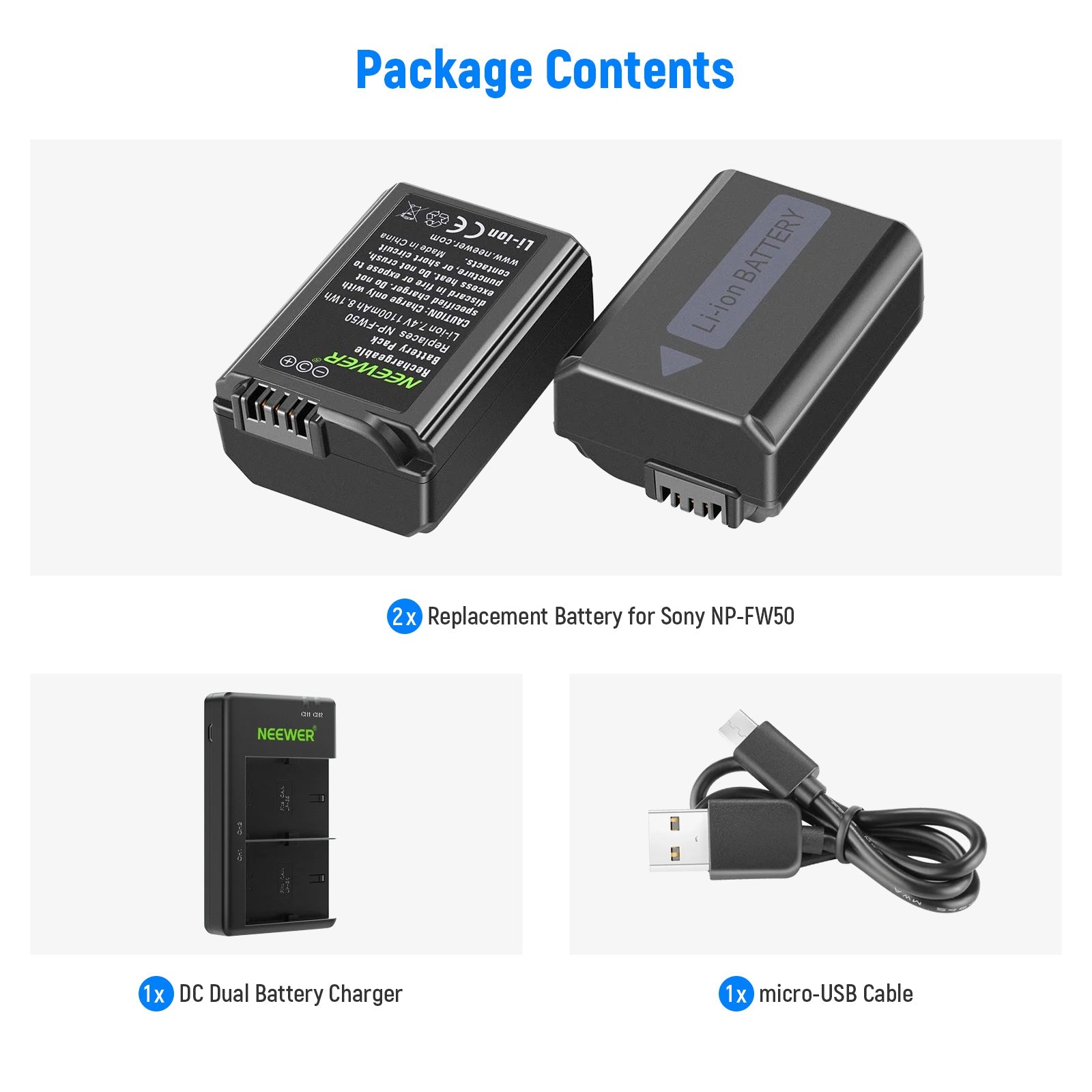 - Les batteries de remplacement Neewer sont conçues selon les spécifications exactes de la batterie Sony NP-FW50, avec une capacité légèrement supérieure de 1100 mAh. Tout comme votre batterie d'origine, les batteries Neewer peuvent être chargées directement dans votre appareil photo ou avec le chargeur d'origine. Le chargeur et la batterie sont entièrement interchangeables.