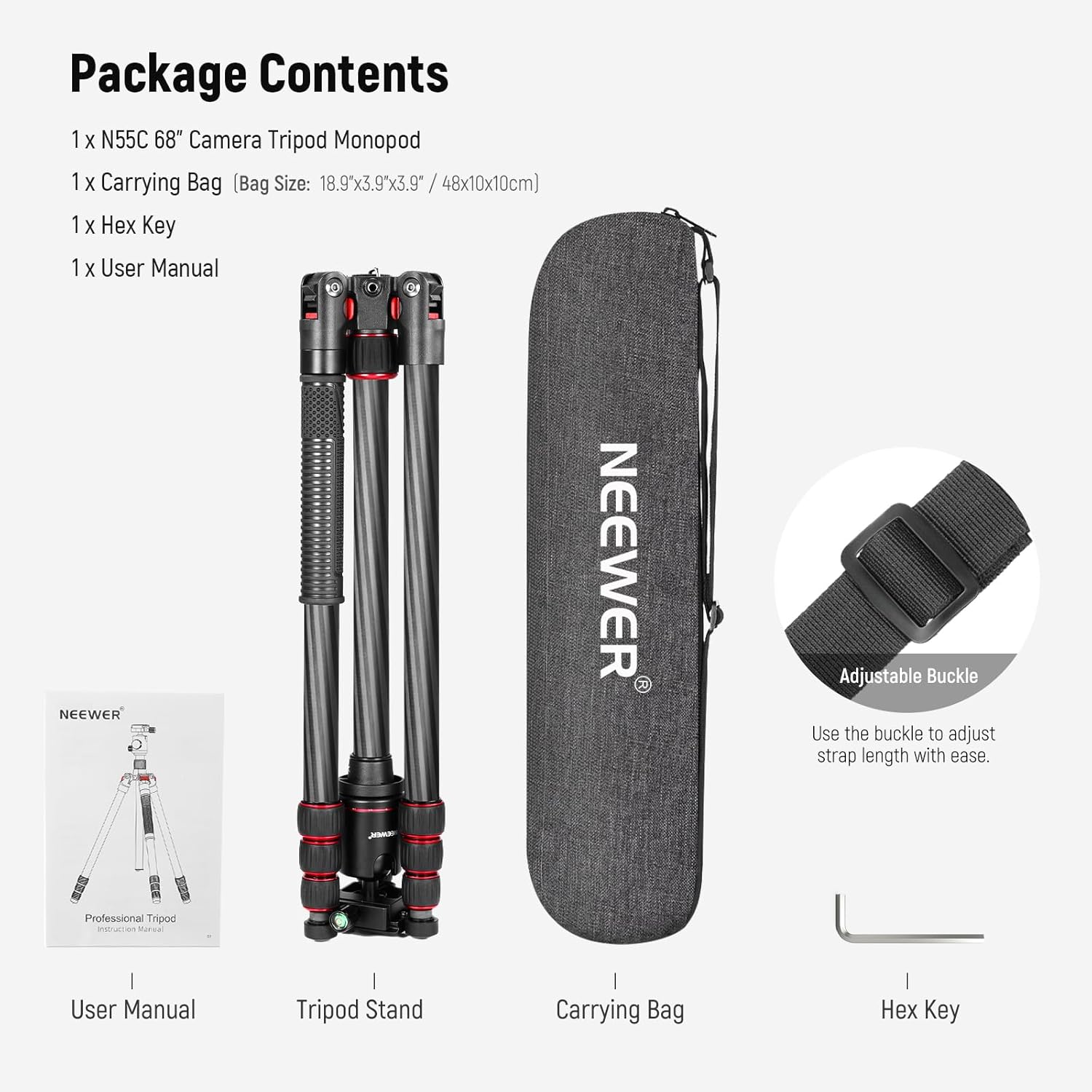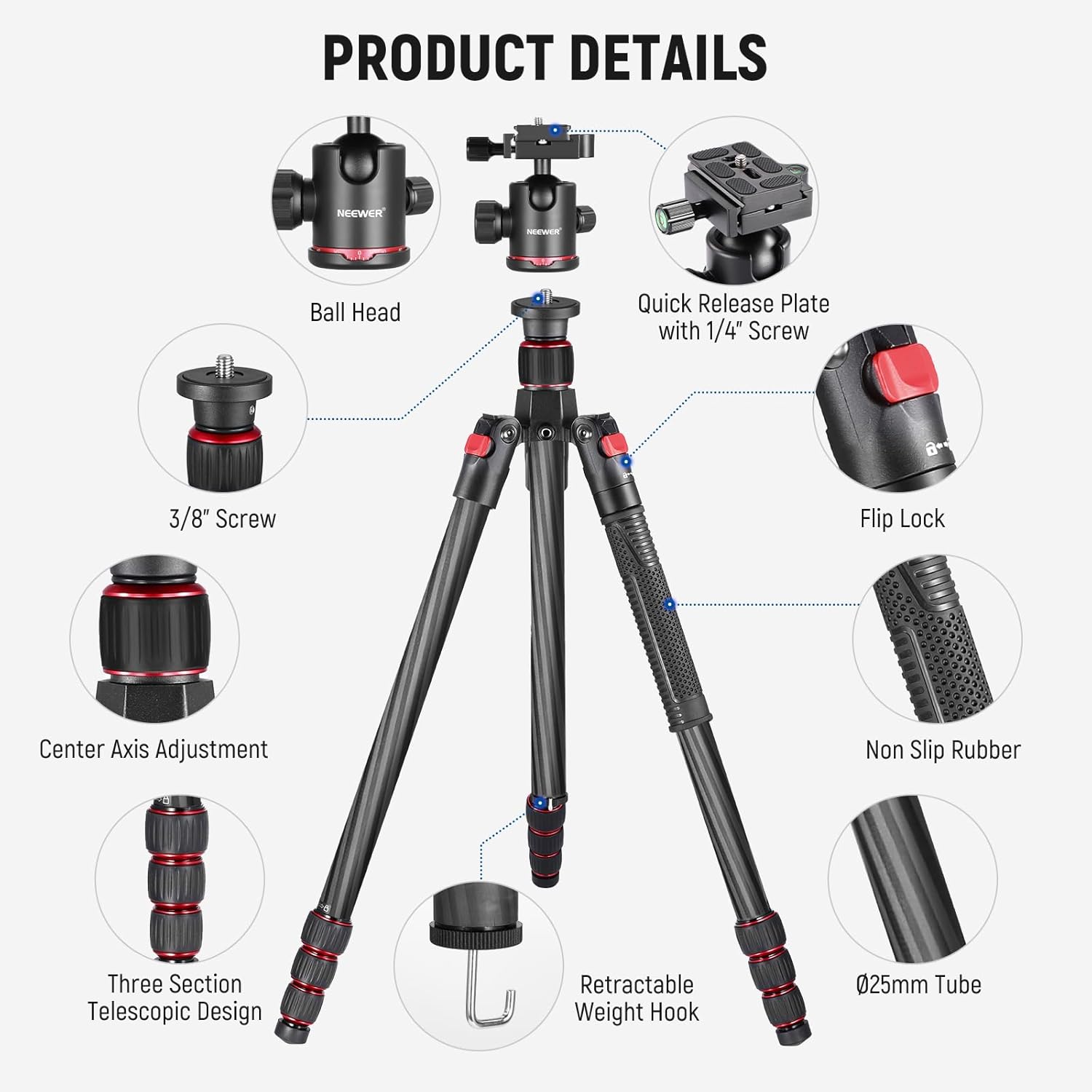 - Trépied/Monopode 2 en 1 - Doté d'un pied détachable et d'une colonne centrale amovible, le trépied en fibre de carbone NEEWER permet une transformation de trépied en monopode (hauteur maximale de 175 cm) pour différentes applications photographiques, notamment la photographie de nature, la macrophotographie et les portraits.