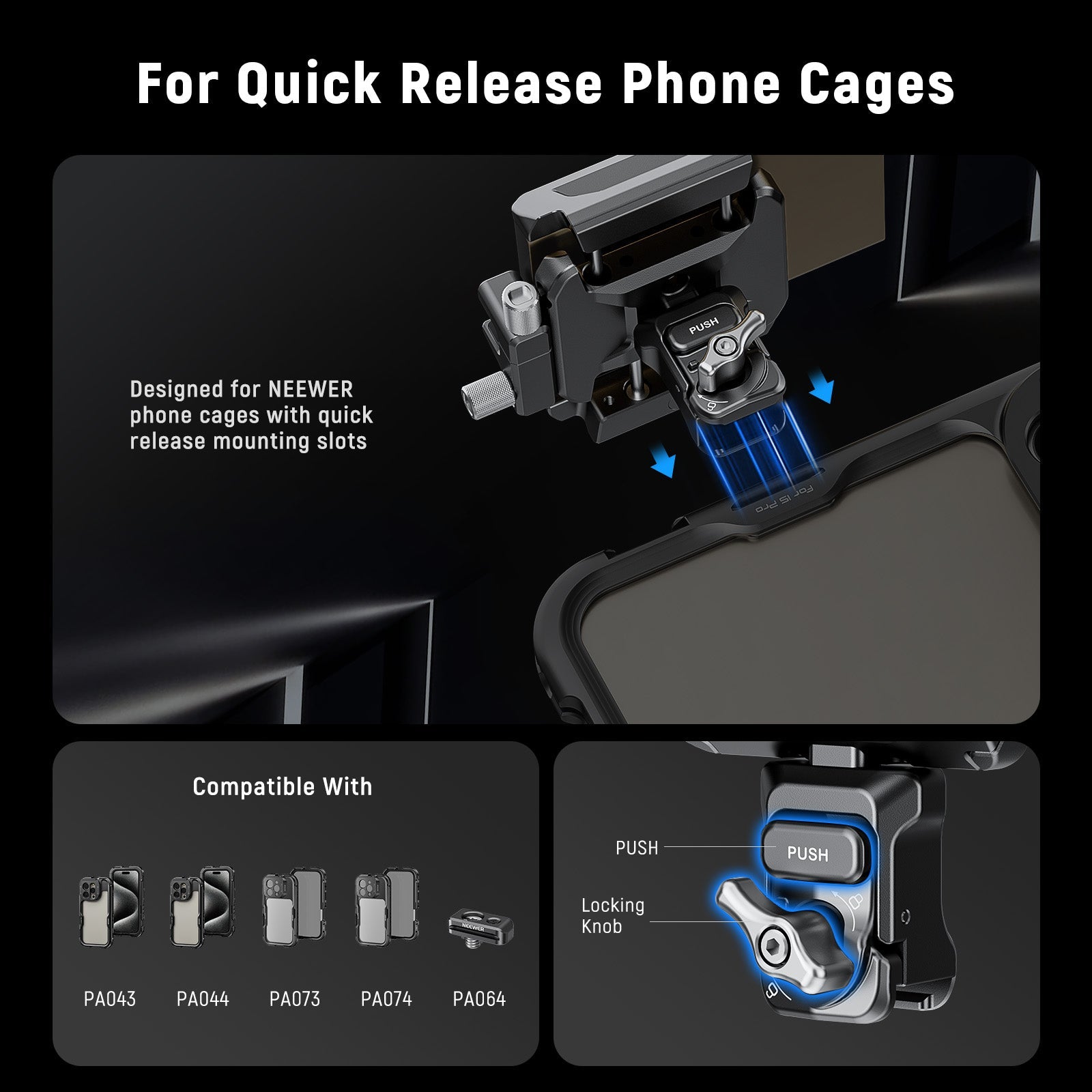 - Pour les cages de téléphone à dégagement rapide : conçues pour les accessoires de cage de téléphone NEEWER dotés de fentes de fixation à dégagement rapide, notamment les modèles PA073/PA074 pour iPhone 16 Pro/Pro Max, PA043/PA044 pour iPhone 15 Pro/Pro Max et PA042 pour Samsung Galaxy S24 Ultra. Remarque : non compatible avec les fentes de fixation à dégagement rapide SmallRig.