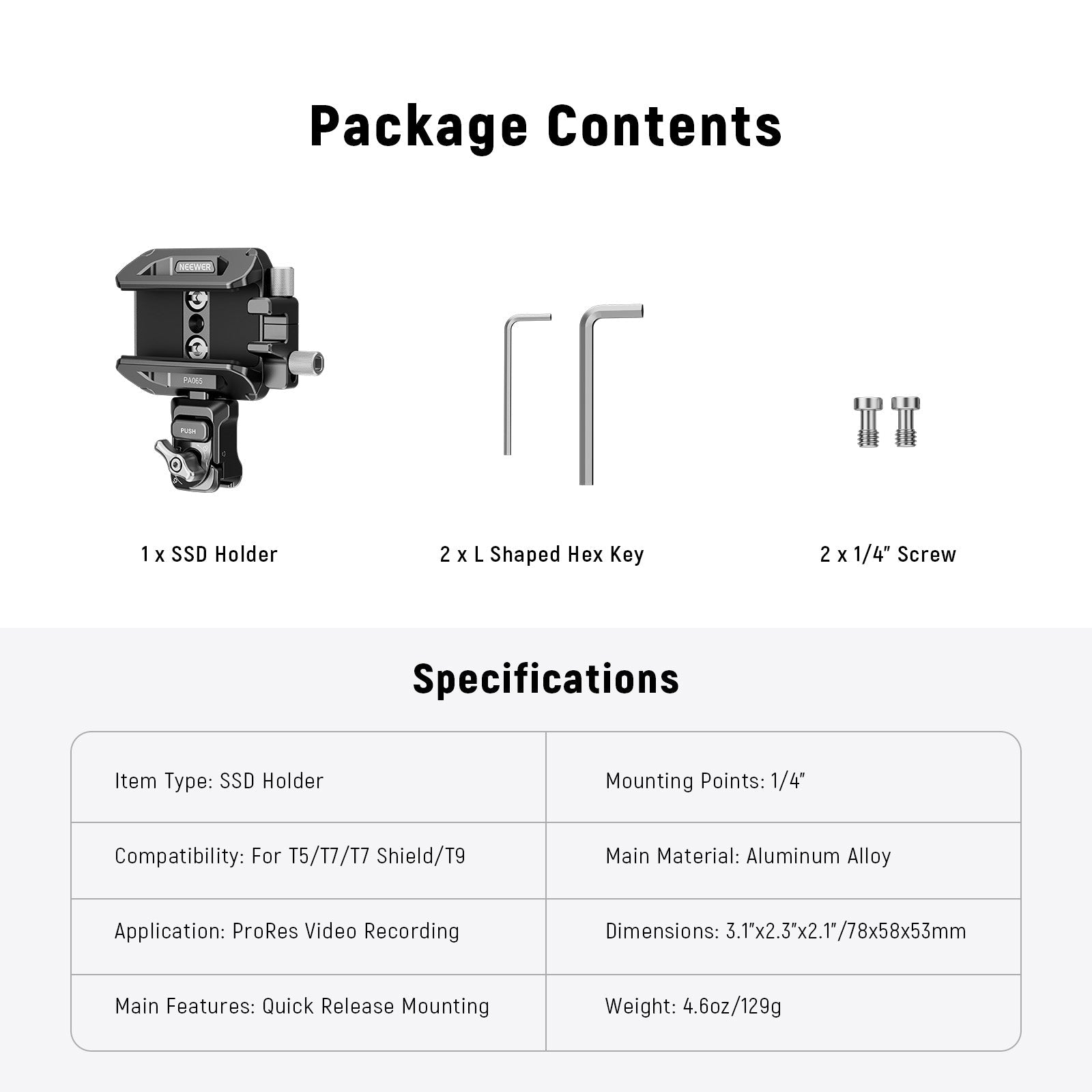 - Trois positions d'installation pour SSD : la pince à dégagement rapide permet un montage horizontal ou vertical (pour un montage vertical, détachez la pince, puis fixez-la de nouveau sur le côté du support SSD). Utilisez les deux vis 1/4" fournies pour fixer le support SSD à une cage de téléphone universelle (NEEWER PA009/PA017). Compatible également avec les cages de téléphone SmallRig.