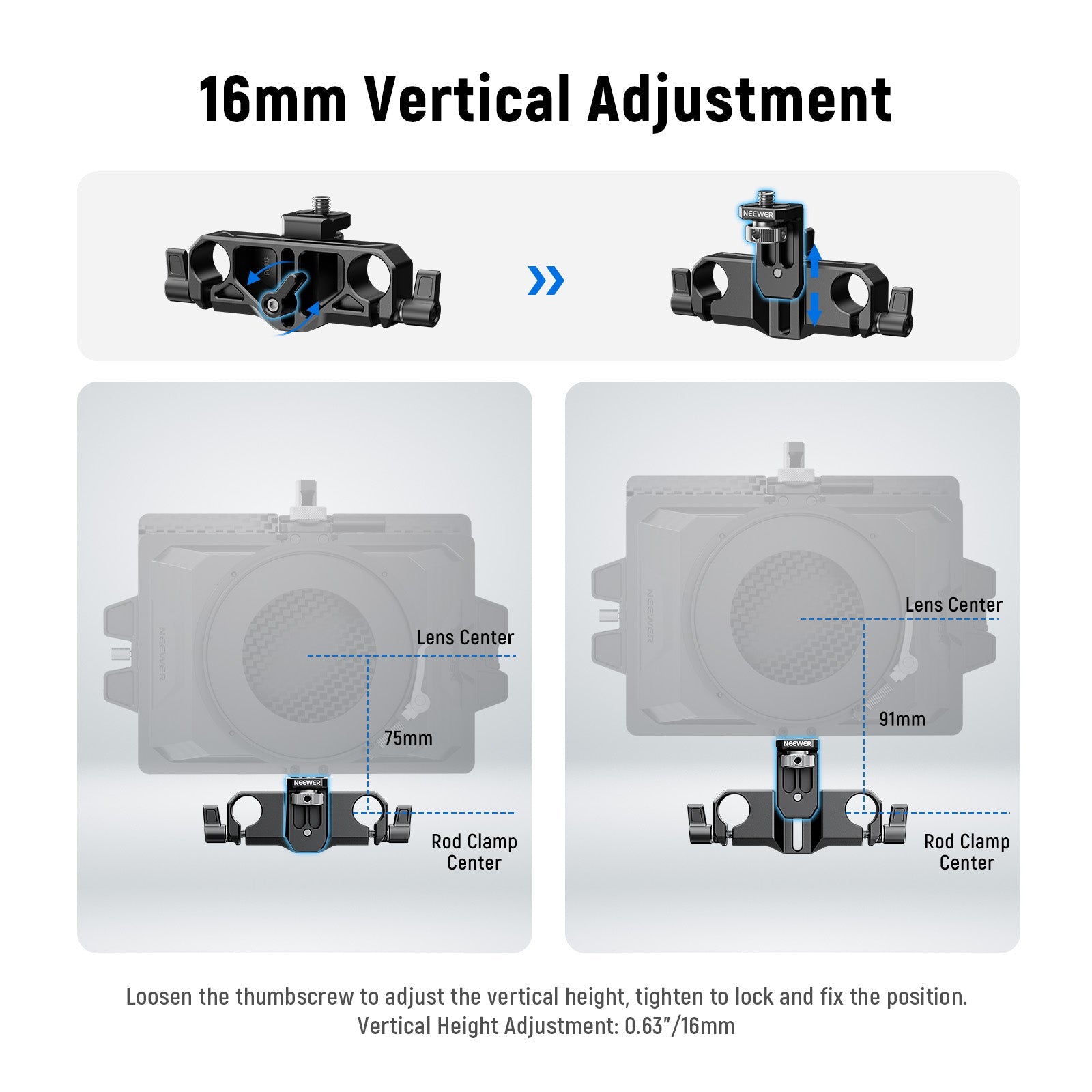 - Réglage vertical de 22 mm (0,87 po ) : ce réglage vertical permet d’accueillir des objectifs d’appareil photo de ø85 à 107 mm. Sa base plate assure une parfaite stabilité sur le bureau.