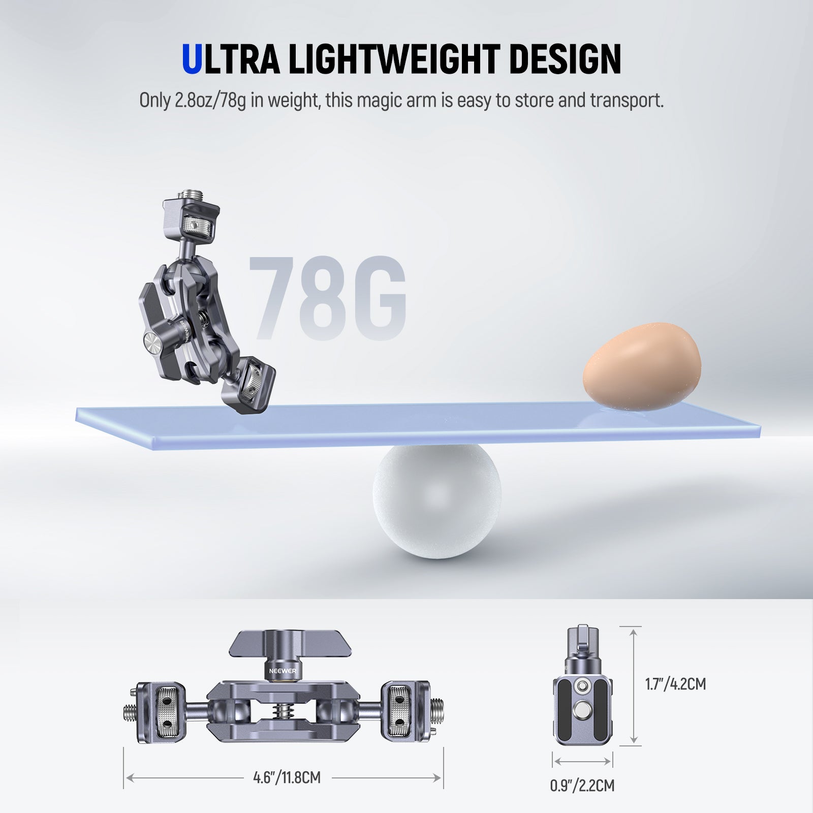 - Conception ultra-légère - Optimisé avec un poids réduit (78 g), ce bras magique est idéal pour la photographie en extérieur, le tournage de films, le vlogging et le streaming en direct. Avec ses dimensions de 118 x 42 x 22 mm, il est portable et se range facilement dans un sac.