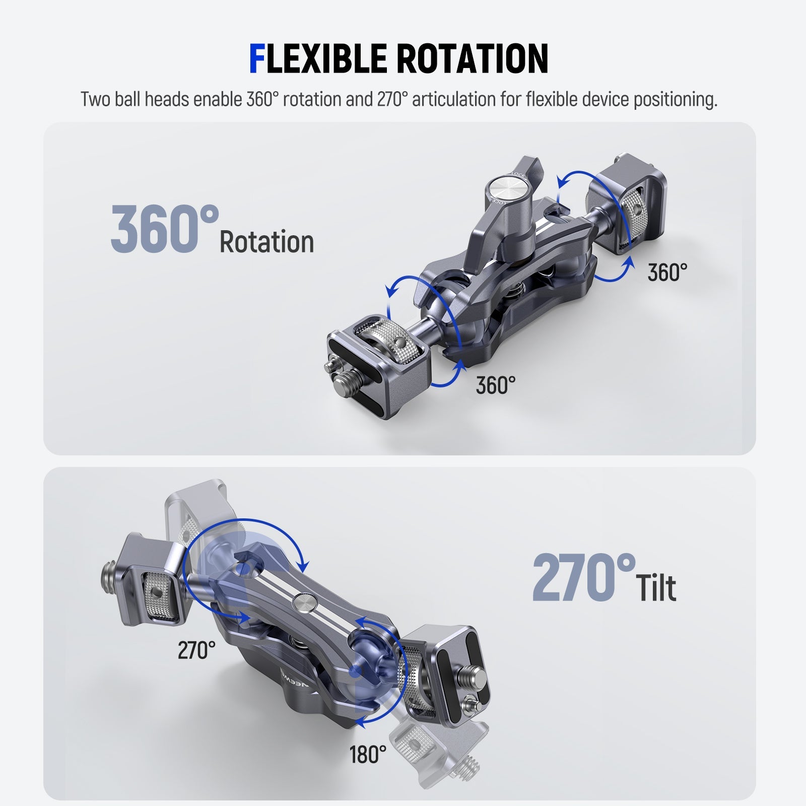 - Rotation à 360° et inclinaison à 270° - Ce bras articulé pour appareil photo, doté de deux rotules, permet une rotation à 360° et une inclinaison à 270° pour un positionnement flexible. Des anneaux en caoutchouc augmentent l'adhérence pour une sécurité accrue.