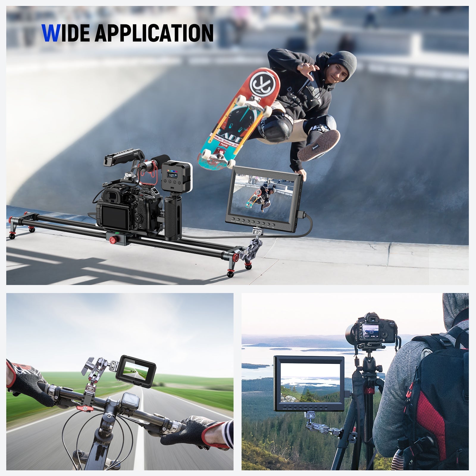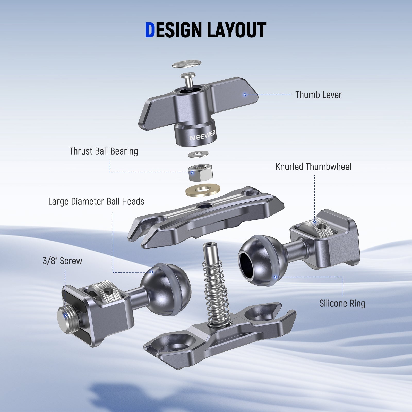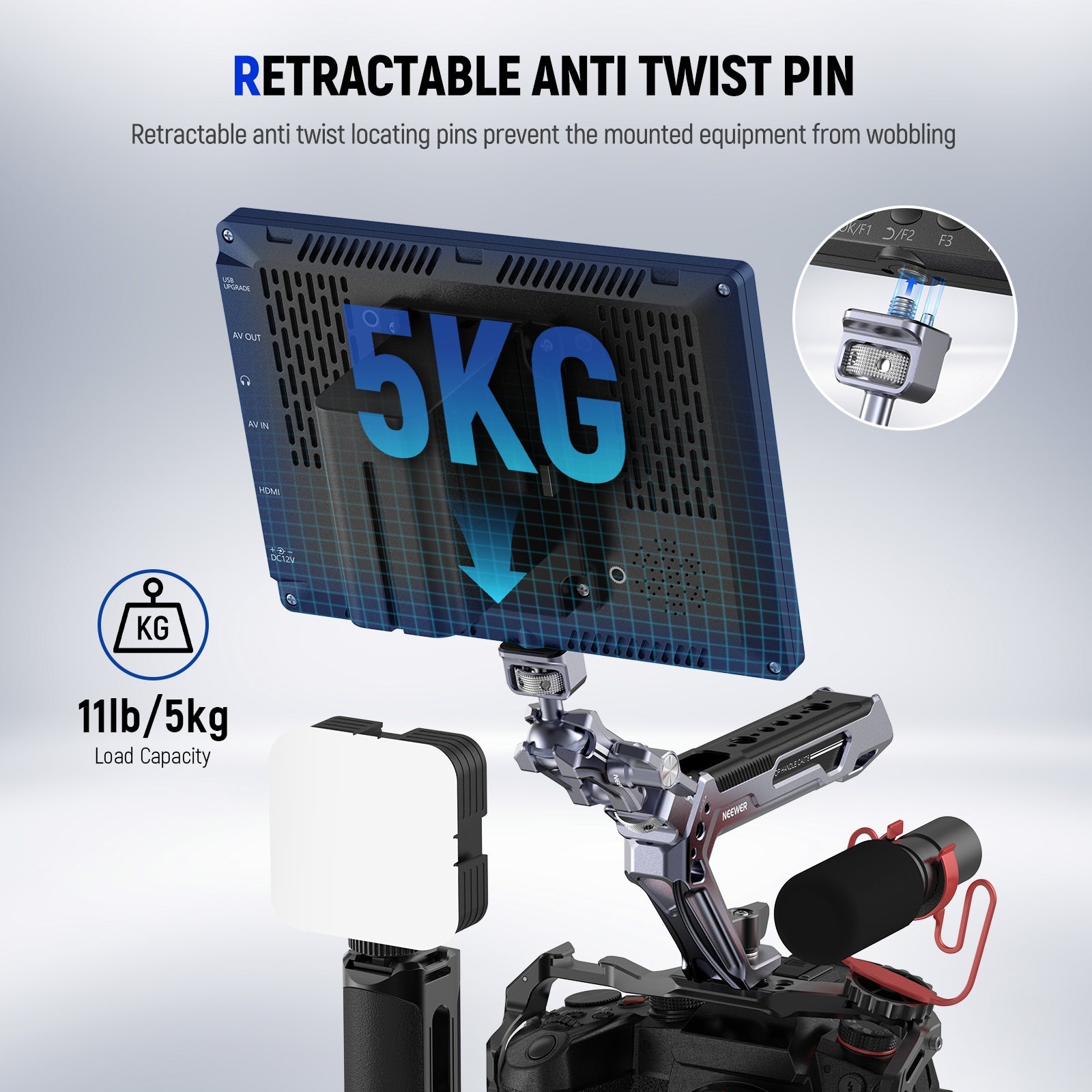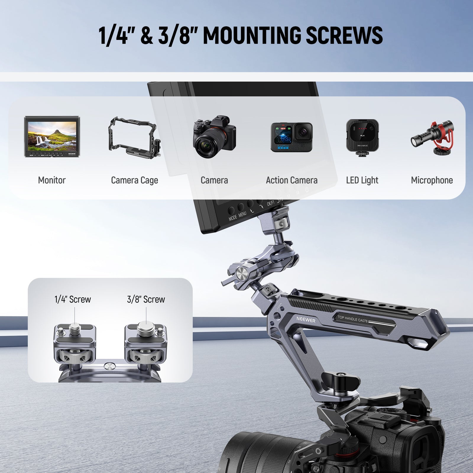 - Vis de fixation 1/4" et 3/8" - Les vis 1/4" et 3/8" sont compatibles avec une large gamme d'appareils jusqu'à 5 kg, notamment les moniteurs de terrain, les éclairages vidéo LED, les microphones, les caméras d'action et les appareils photo hybrides. Elles sont également compatibles avec les cages, les supports vidéo et les pinces de fixation SmallRig et NEEWER.