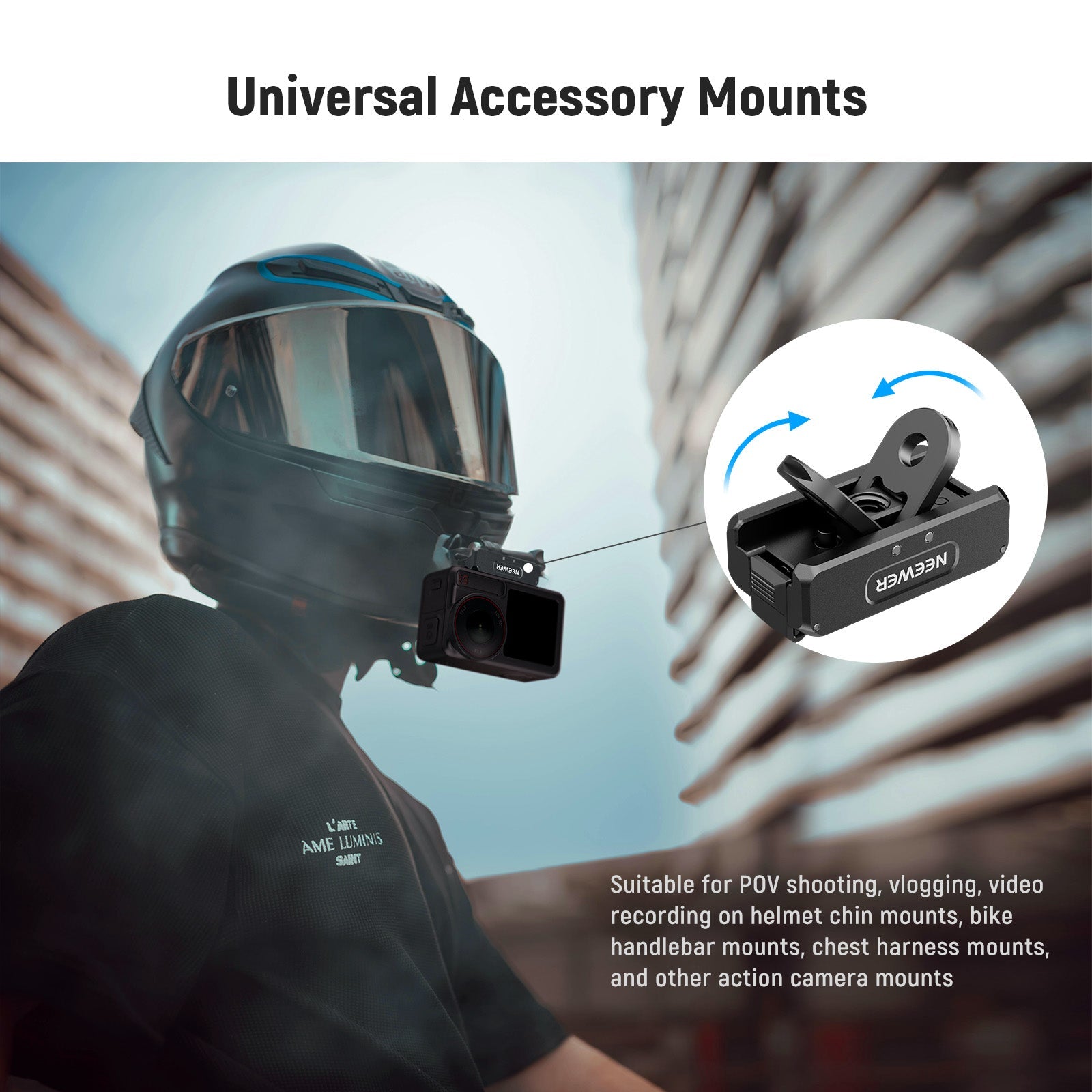 • Supports universels pour accessoires - Adaptateurs pliables compatibles avec la plupart des accessoires de caméras d'action, idéaux pour les prises de vue subjectives, le vlogging, l'enregistrement vidéo sur mentonnière de casque, guidon de vélo, harnais de poitrine, etc.