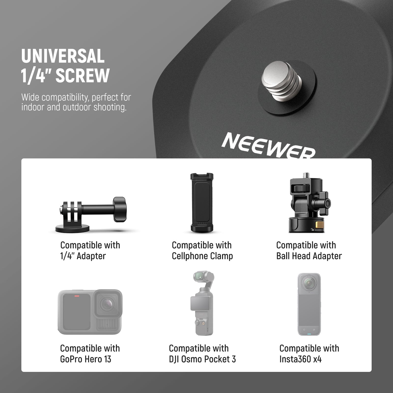 • Pour les caméras à filetage 1/4" - Le support magnétique NEEWER AC016 est doté d'une vis universelle 1/4" qui se fixe à fleur des caméras stabilisées ou des caméras d'action équipées d'un filetage standard 1/4". Il est compatible avec le DJI Osmo Pocket 3 et les Insta360 X3/2/1. Vous pouvez même l'utiliser pour fixer un smartphone magnétique pour le vlogging, le streaming en direct, etc.