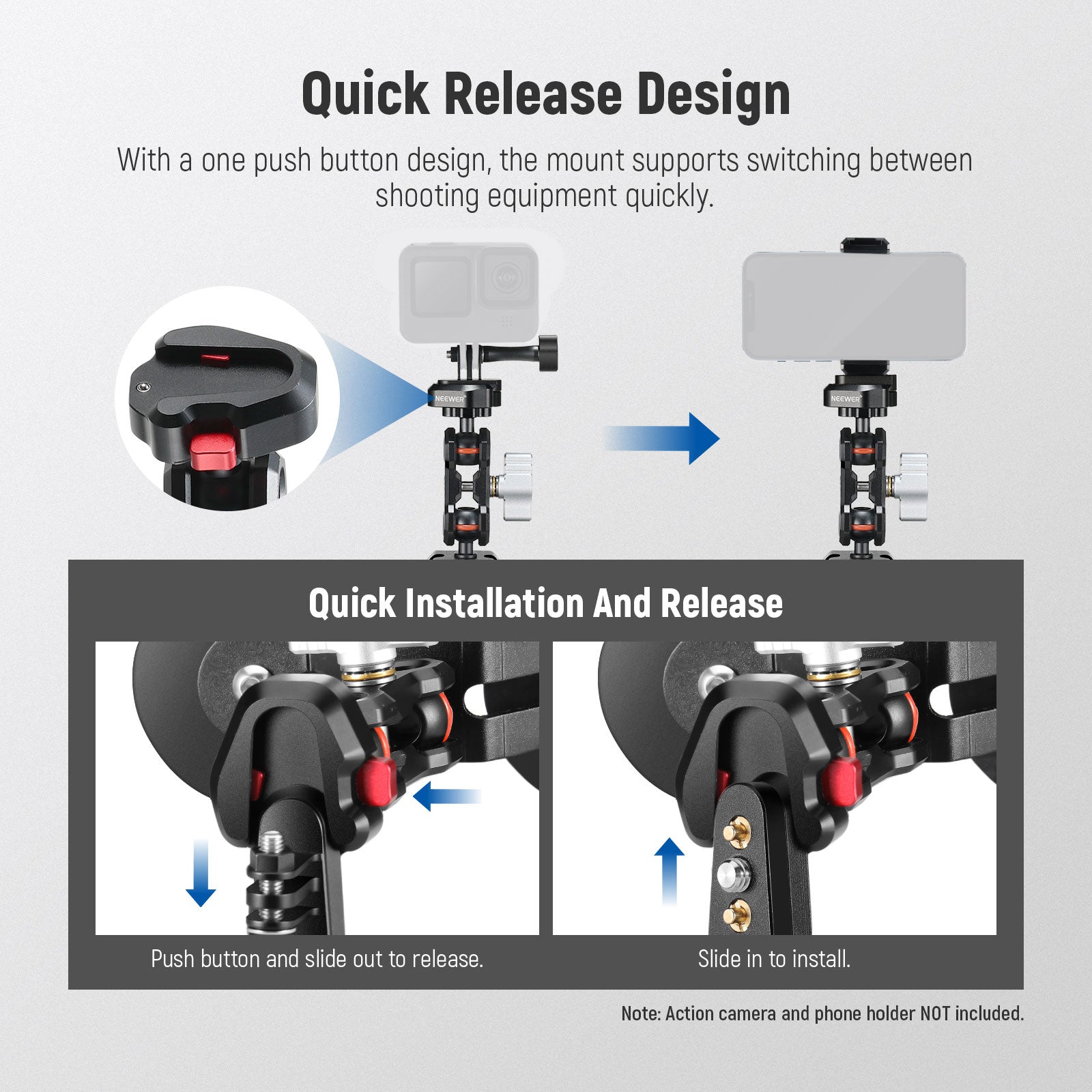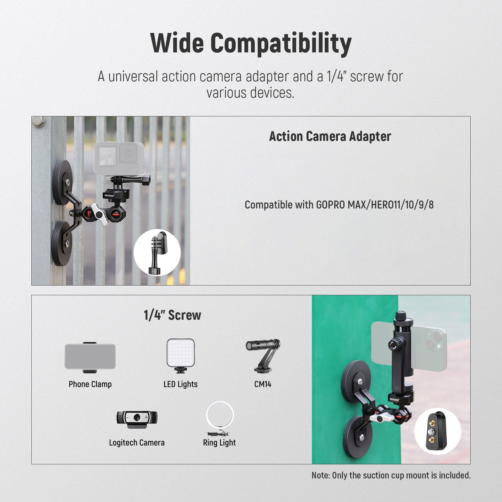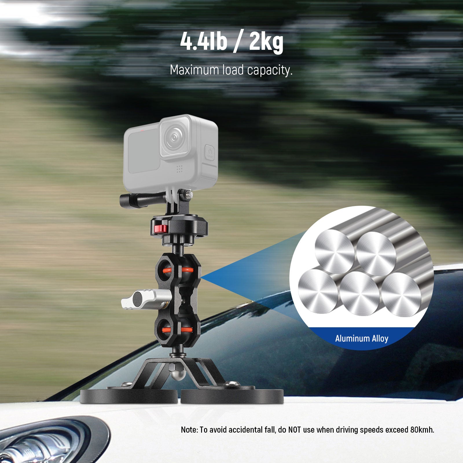 - Excellente force magnétique : les deux ventouses magnétiques offrent une forte adhérence et une force de traction verticale allant jusqu’à 10 kg. Les ventouses sont recouvertes de silicone souple pour éviter les rayures sur votre voiture. L’une des ventouses peut être retirée à l’aide de la clé Allen fournie pour passer à un support de caméra à ventouse unique, idéal pour les espaces restreints ou les objets légers.