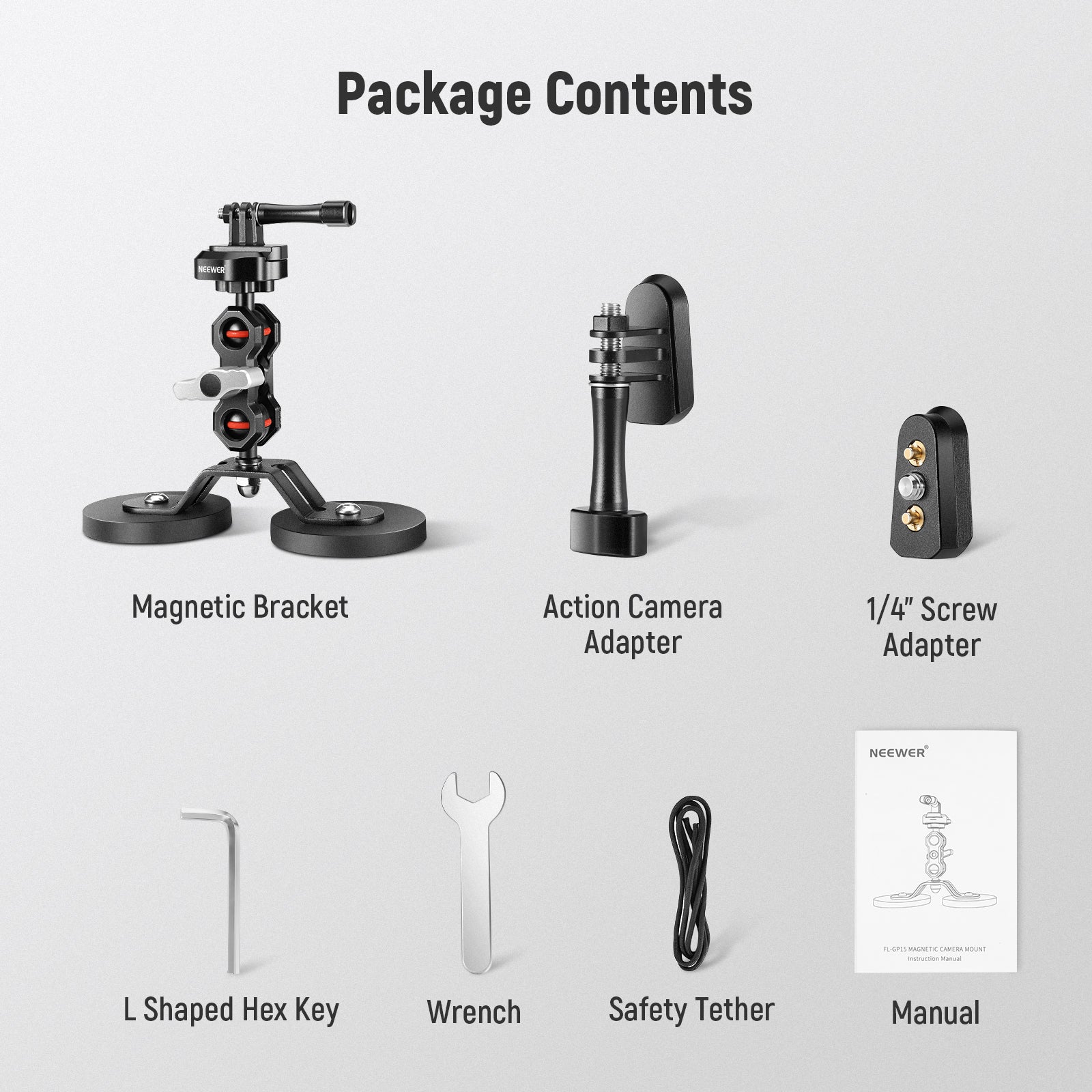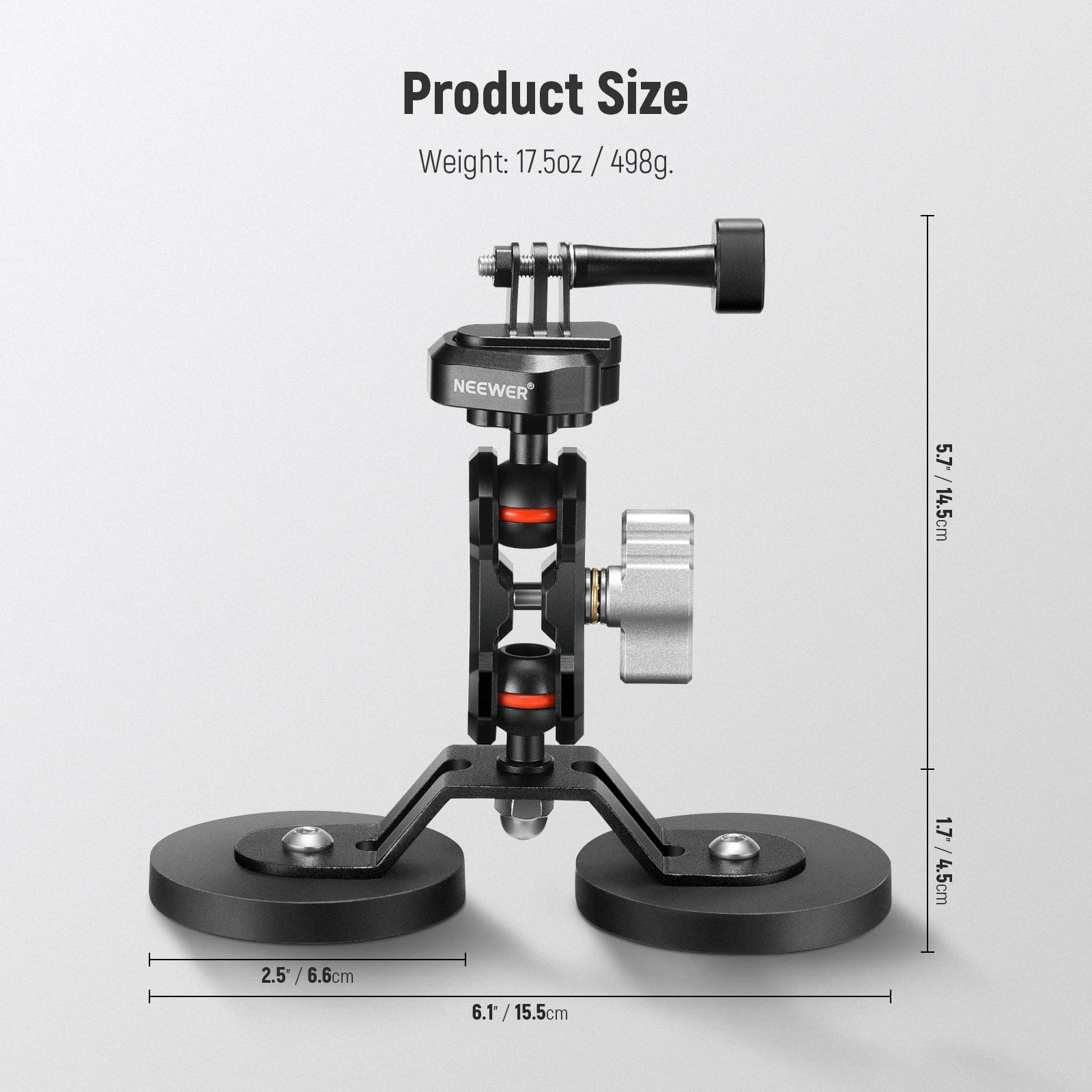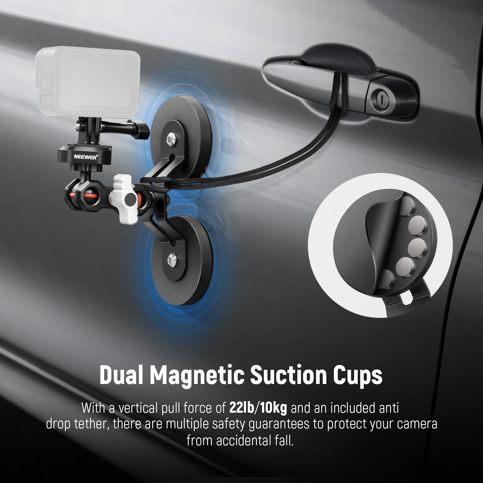 - Support magnétique double ventouses NEEWER FL-GP15 pour caméra d'action : plus puissant qu'un aimant simple, ce support supporte une charge maximale de 2 kg et adhère fermement au capot, au toit, aux portières de voiture ou à toute autre surface métallique. La dragonne de sécurité incluse permet de l'attacher à une poignée de portière, à des barres de toit ou à un rétroviseur pour éviter toute chute en cours de route.