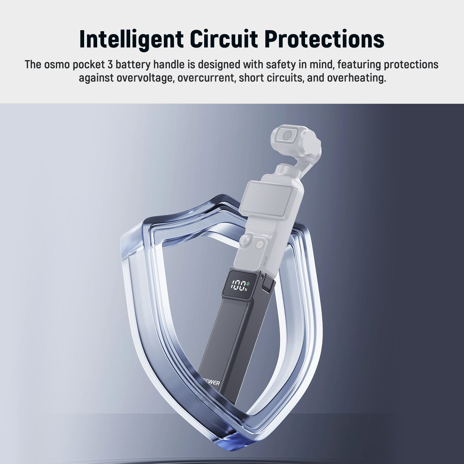 • Protections intelligentes du circuit : la poignée de la batterie de l’osmo pocket 3 est conçue pour une sécurité optimale, avec des protections contre les surtensions, les surintensités, les courts-circuits et la surchauffe. En cas de problème, la poignée s’éteint automatiquement après l’affichage d’une alerte à l’écran, pour une utilisation en toute sérénité.