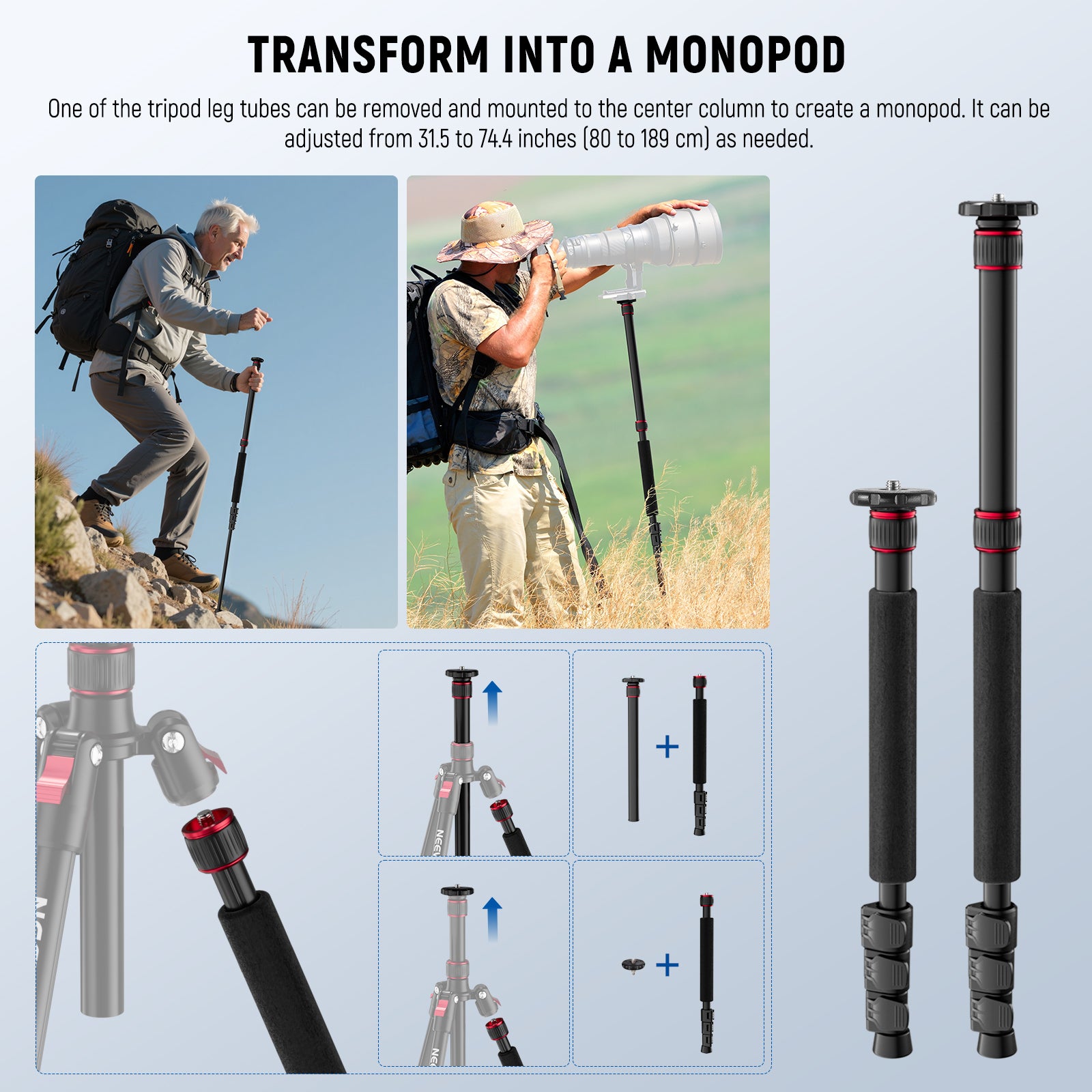 - Transformable en monopode : l’un des tubes des pieds du trépied se démonte rapidement et se connecte à l’axe central pour se transformer en monopode. Idéal pour capturer des situations rapides et dynamiques, il peut également servir de bâton de randonnée. La hauteur du monopode est réglable de 80 cm à 189 cm. Ce trépied, doté d’un support pour téléphone compatible avec l’iPhone, est un accessoire indispensable pour les créateurs de contenu, les photographes et vidéastes, ainsi que les influenceurs.
