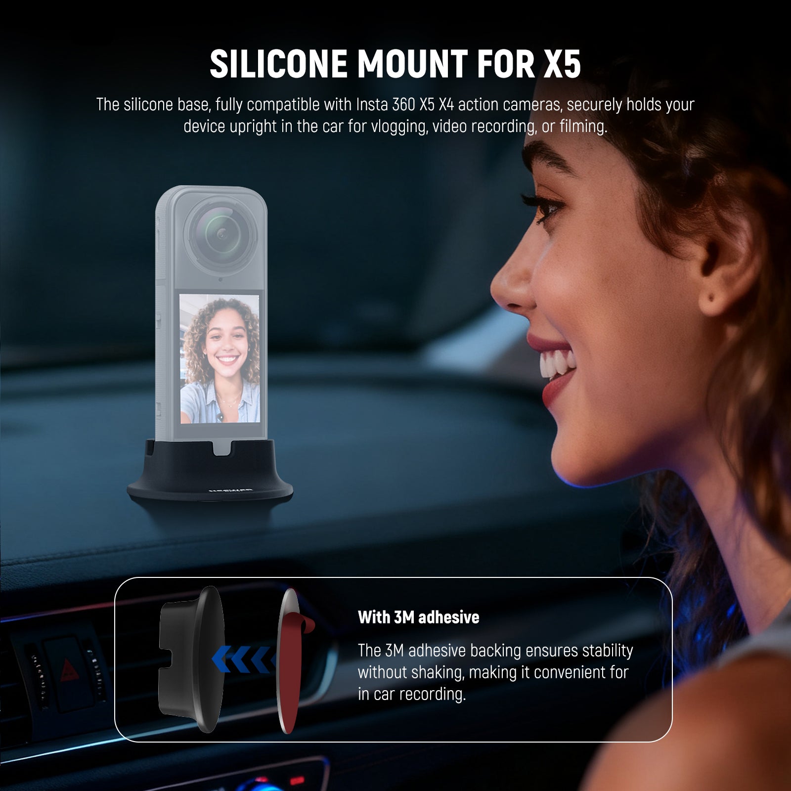 - Desktop Car Mount Compatible with Insta360 X5 X4- The silicone holder base is fully compatible with Insta 360 X5 X4 as action camera accessories, using the reusable adhesive on the bottom, to securely hold your device upright in the car for POV vlogging, video recording, or filming