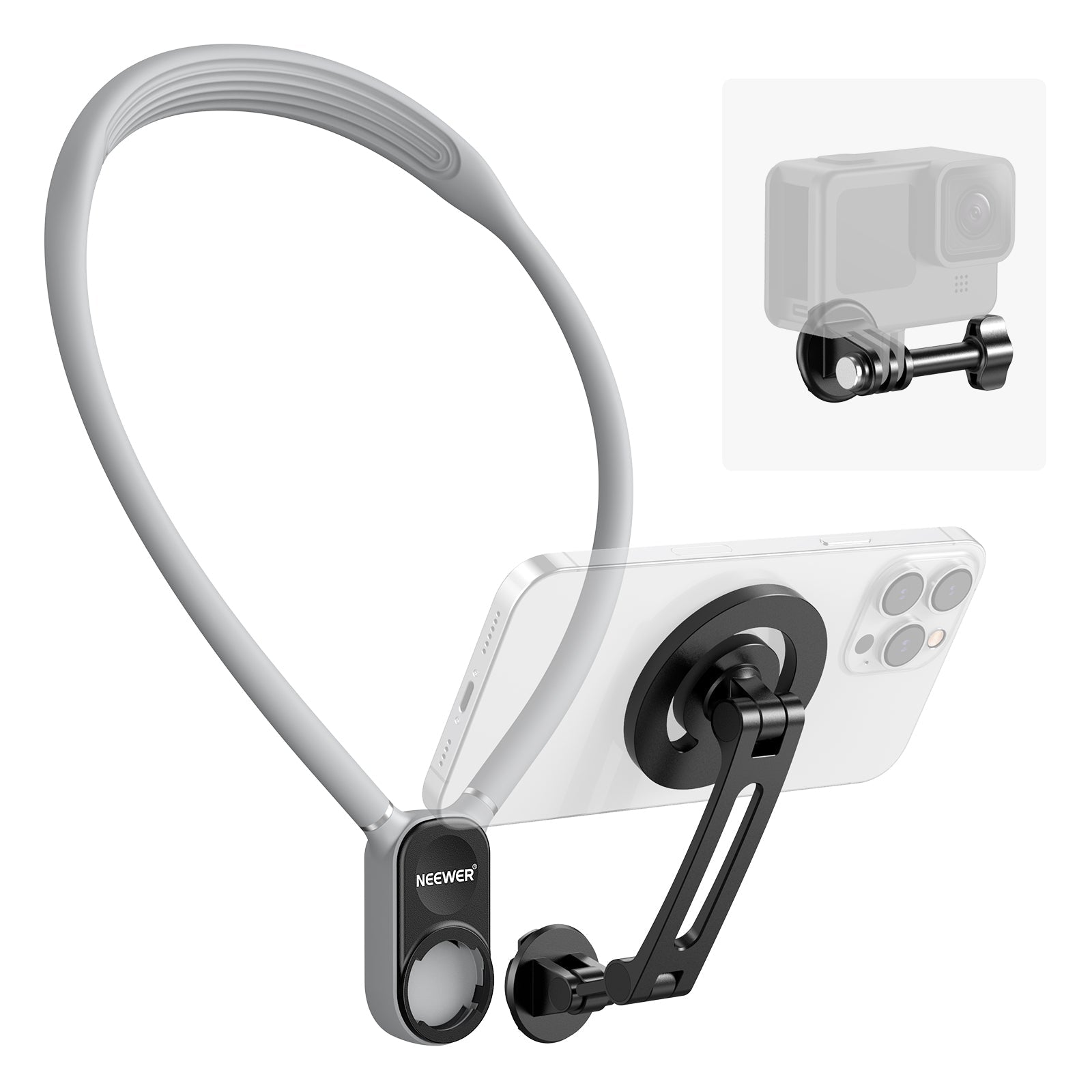 - Support de cou magnétique pour prises de vue subjectives - Conçu pour les smartphones et les caméras d'action, ce support de cou magnétique à fixation rapide vous permet de garder les mains libres pour les prises de vue subjectives. Ses charnières robustes entièrement métalliques assurent une fixation solide à vos appareils, tandis que son revêtement en silicone doux et hypoallergénique garantit un confort optimal autour du cou ou de l'épaule. La sangle de cou mesure 60 cm (24 pouces) une fois entièrement déployée. Remarque : Ne pas utiliser ce support de cou magnétique lors de scènes d'action à grande vitesse.