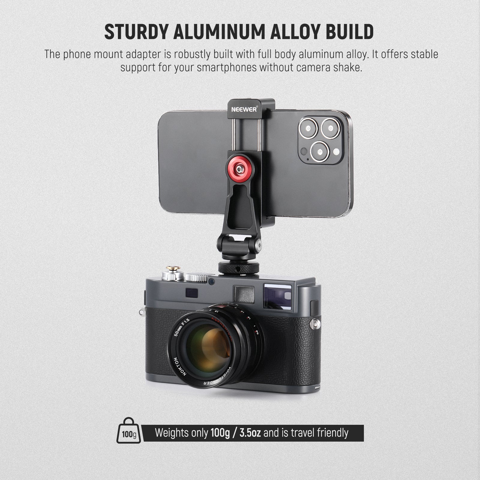 • Adaptateur de support pour téléphone hautement adaptable - Cet adaptateur métallique est doté d'une griffe porte-accessoires et d'un filetage 1/4" à sa base. Fixez-le sur un appareil photo grâce à la griffe porte-accessoires, ou connectez-le à un trépied ou un pied d'éclairage à l'aide d'une vis 1/4".
