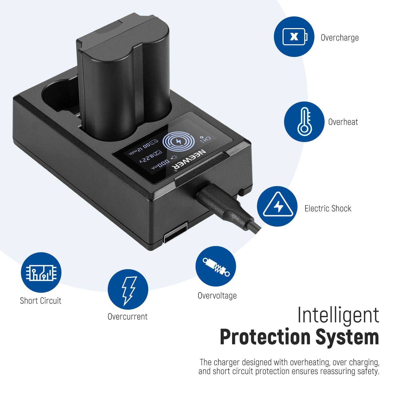 - Écran LCD facile à lire : le chargeur est équipé d’un écran LCD affichant clairement la progression de la charge en temps réel, la tension de charge et d’autres informations pour les deux emplacements de charge. Avec une entrée de charge de 5 V/2,1 A, il protège efficacement les batteries contre la surcharge, la surchauffe, la surintensité, la surtension, les courts-circuits et les chocs électriques.