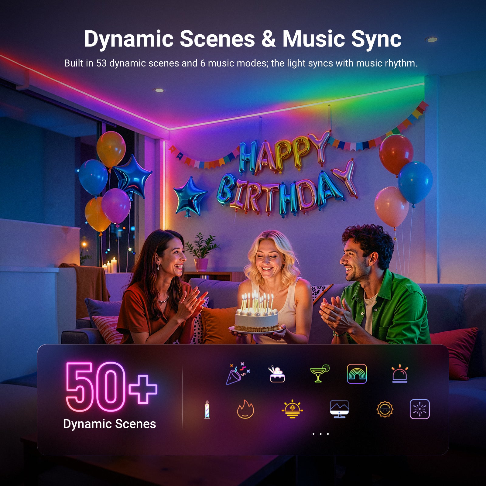 - Scènes dynamiques et synchronisation musicale : la guirlande lumineuse LED néon propose 53 scènes prédéfinies inspirées du quotidien, des fêtes, des émotions et de la nature. Des mises à jour régulières ajoutent de nouveaux effets pour un éclairage original et personnalisé. Le boîtier de commande inclus est doté d'un microphone intégré qui détecte la musique en temps réel, permettant ainsi à la guirlande de changer de couleur au rythme de la musique ou des effets sonores des jeux vidéo, pour une ambiance dynamique et immersive.