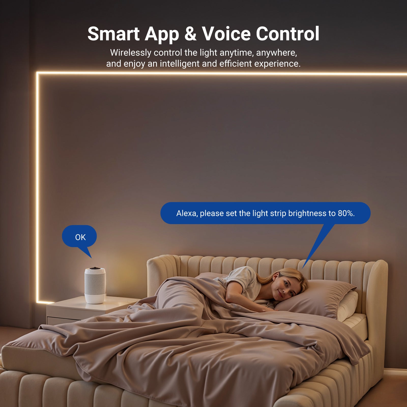 - LED RGB avancées - Chaque mètre comprend 84 LED RGB haute performance et 14 points de contrôle. Ce ruban LED permet un contrôle segmenté, offrant ainsi la possibilité de gérer chaque section individuellement et de réaliser des transitions fluides, des effets de lumière continus, cycliques ou clignotants entre plusieurs couleurs pour créer des effets lumineux harmonieux et dynamiques. Ce ruban néon peut également diffuser une lumière blanche douce pour un éclairage fonctionnel au quotidien, réglable de 2700 K à 6500 K.