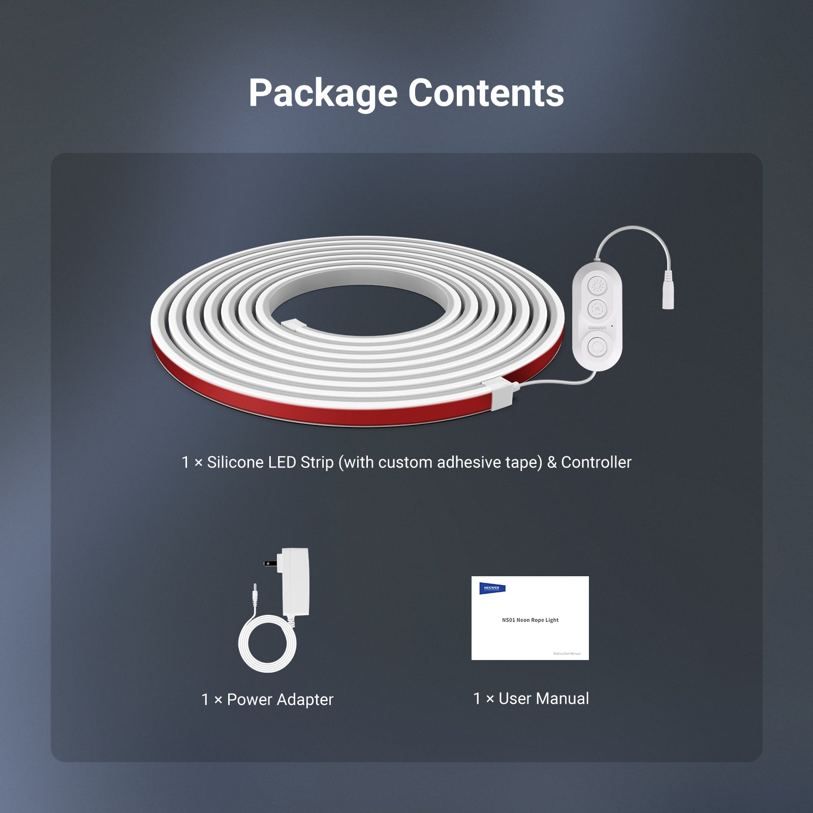 - Bande LED néon NS01 en silicone souple et lumineuse - Fabriquée en silicone 100% étanche, la bande LED néon NS01 est douce, flexible et facile à plier, ce qui permet une installation aisée dans les chambres, les coins, sous les avant-toits, le long des murs ou à l'intérieur des armoires. Son design à émission frontale, avec 252 LED (84 LED/m) intégrées dans la bande en silicone à haute transmission, diffuse une lumière colorée, vive et naturelle, créant une ambiance chaleureuse et accueillante.
