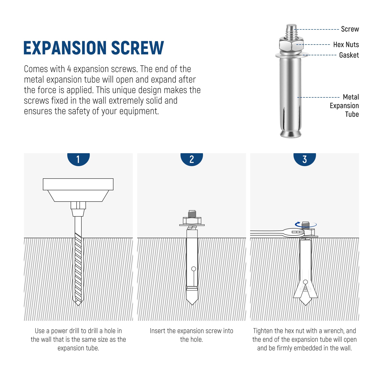 - Fixations incluses : 6 vis autotaraudeuses et 4 vis d’expansion sont fournies pour une installation simple et sécurisée. Tournevis et perceuse non inclus.