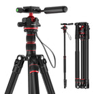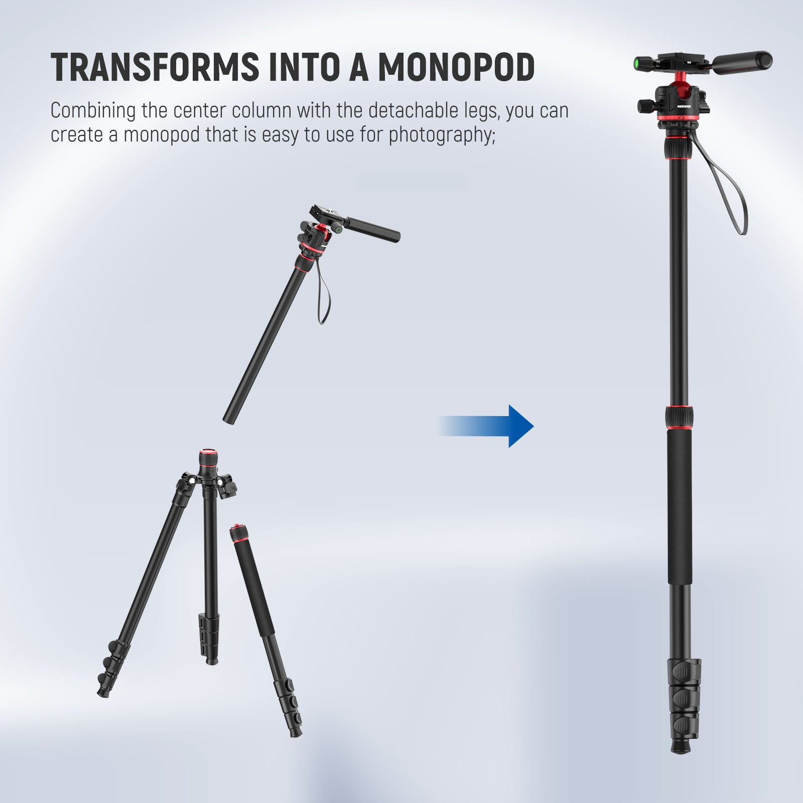- Trépied et monopode 2 en 1 : passez facilement du trépied au monopode ! Il suffit de détacher un pied du trépied et de le fixer à la colonne centrale. Idéal pour des prises de vue professionnelles et stables, des photos à longue exposition avec le trépied et des photos rapides en mouvement avec le monopode. De plus, le monopode peut également servir de bâton de randonnée !